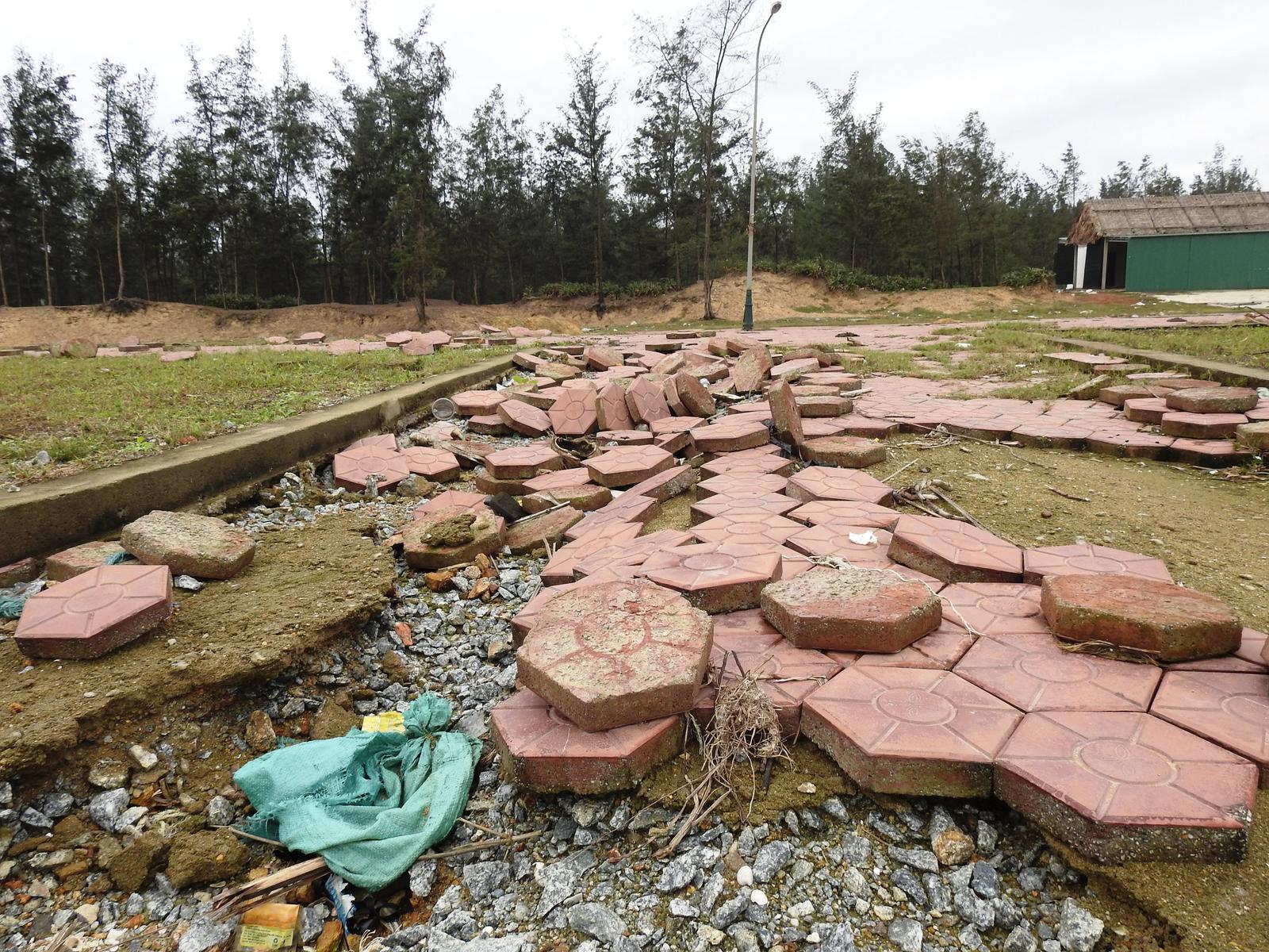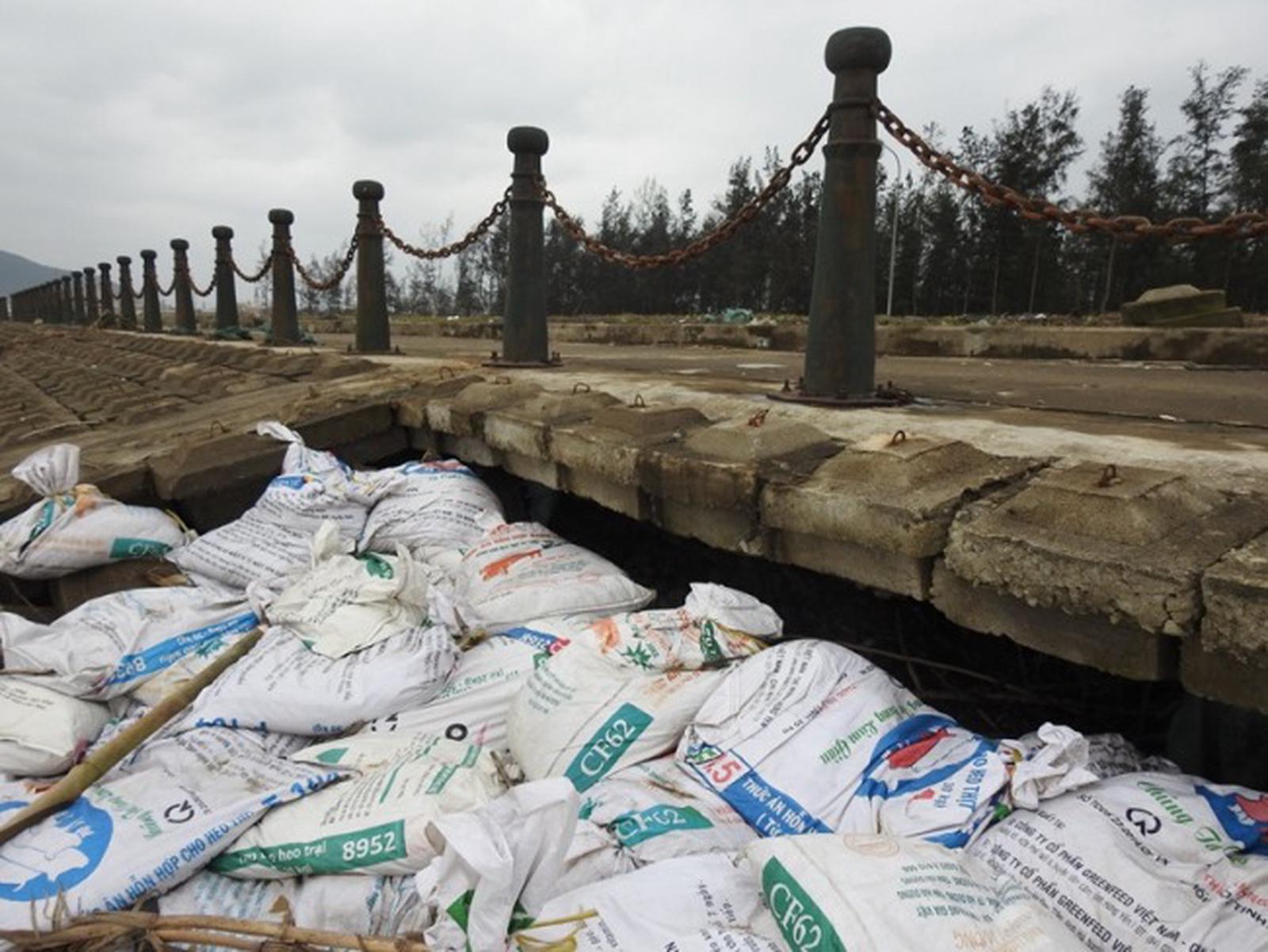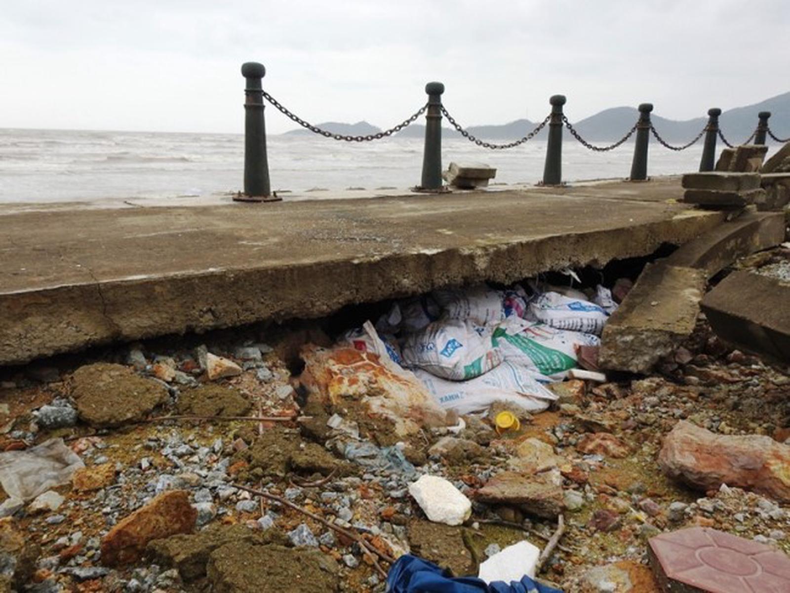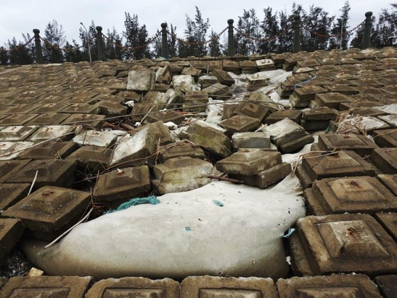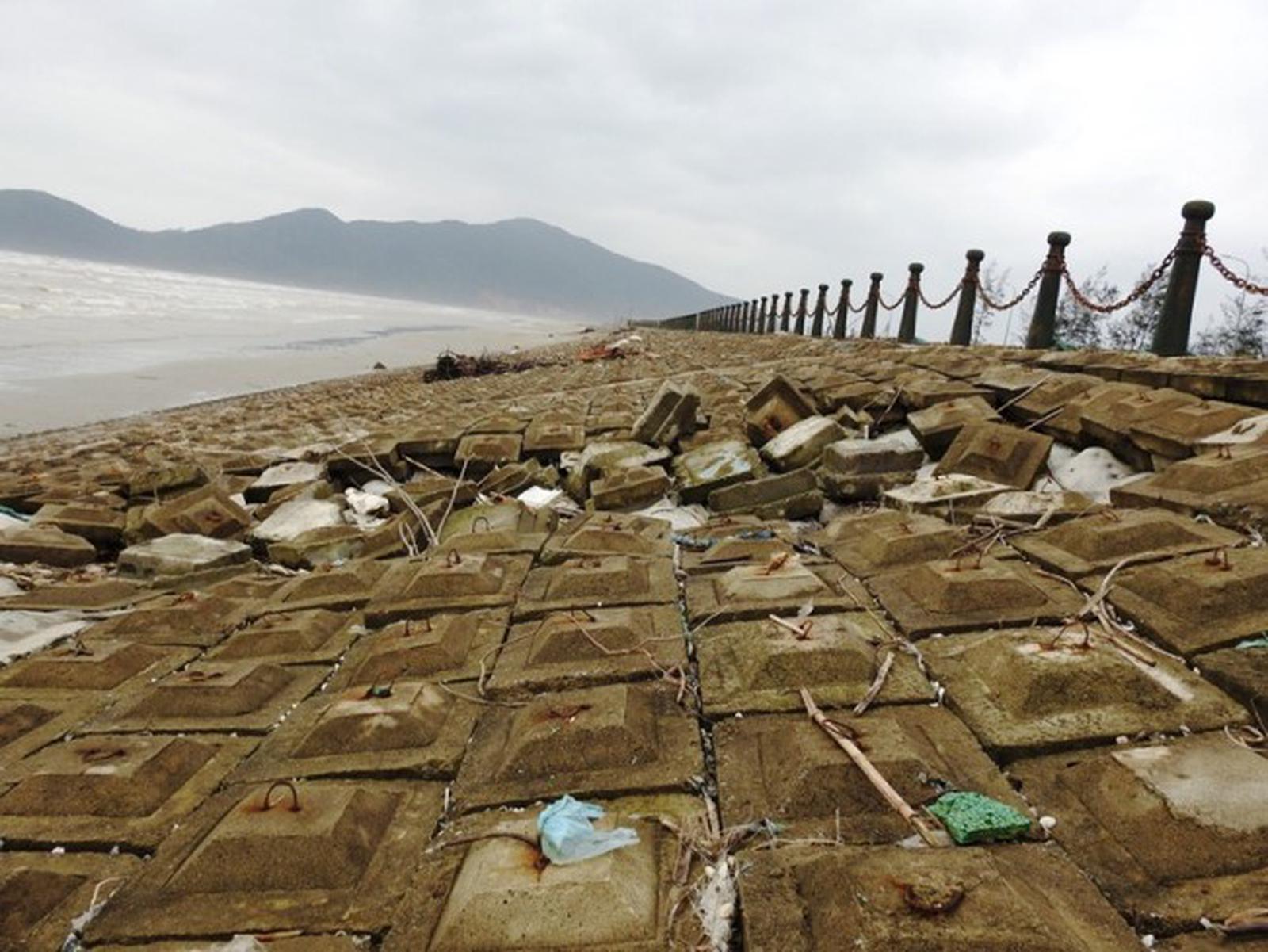 Phần mái đê bị gãy, rạn nứt và xuyên thấu đe dọa đến an toàn đê. Ảnh: HY Bê tông dày hơn 30cm bị bẻ gãy một cách dễ dàng, khiến người dân bất an. Ảnh: HYNếu không sớm được khắc phục thì toàn bộ tuyến đê sẽ bị đặt trong tình trạng mất an toàn. Ảnh: HYHình ảnh một khu du lịch nham nhở, nhếch nhác là những gì còn lại sau cơn bão số 10. Ảnh: HY Hải Yến
