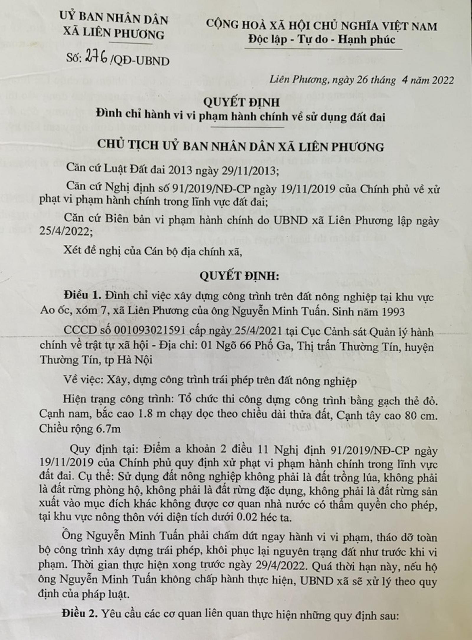Ngày 26/4/2022, Chủ tịch UBND xã Liên Phương Nguyễn Văn Hải ban hành Quyết định số 276 đình chỉ xây dựng công trình trái phép trên đất nông nghiệp tại khu vực Ao Ốc, xóm 7 xã Liên Phương đối với ông Nguyễn Minh Tuấn.