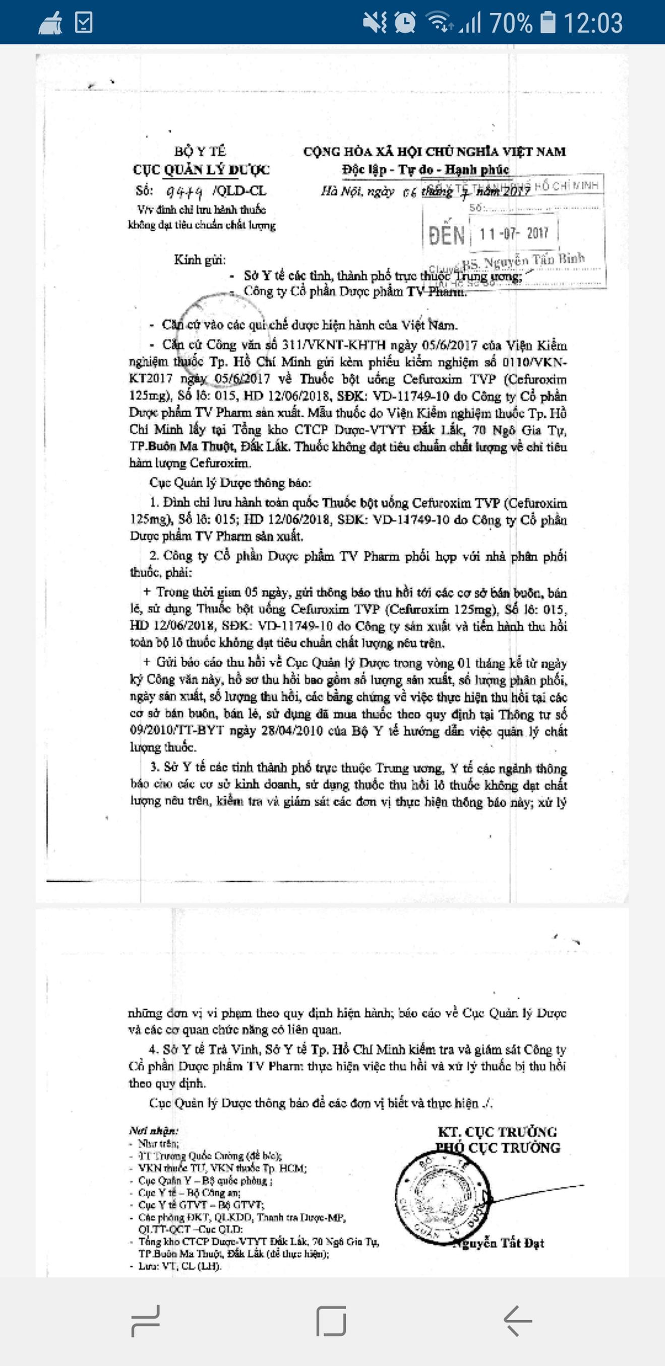 Cục Quản lý Dược có Công văn số 9479/QLD-CL v/v đình chỉ lưu hành thuốc không đạt tiêu chuẩn chất lượng, với thuốc bột uống Cefuroxim TVP, số lô 015, do Công ty Cổ phần Dược phẩm TV.Pharm sản xuất