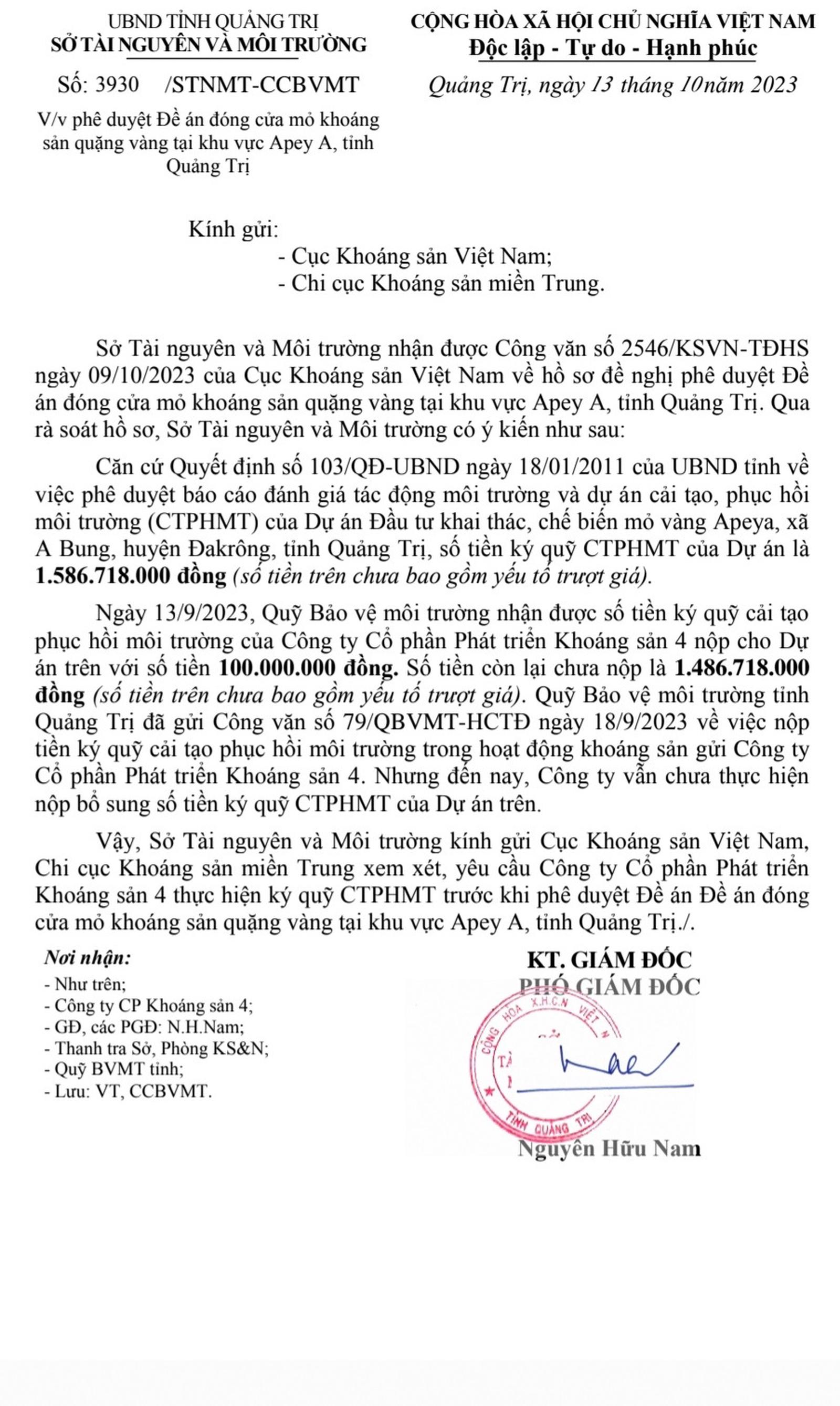 Trước sự việc trên, Sở TN&MT tỉnh Quảng Trị đã có văn bản gửi Cục Khoáng sản Việt Nam, Chi cục Khoáng sản miền Trung xem xét, yêu cầu Công ty Khoáng sản 4 thực hiện ký quỹ CTPHMT trước khi phê duyệt đề án đóng cửa mỏ khoáng sản quặng vàng tại khu vực Apey A.