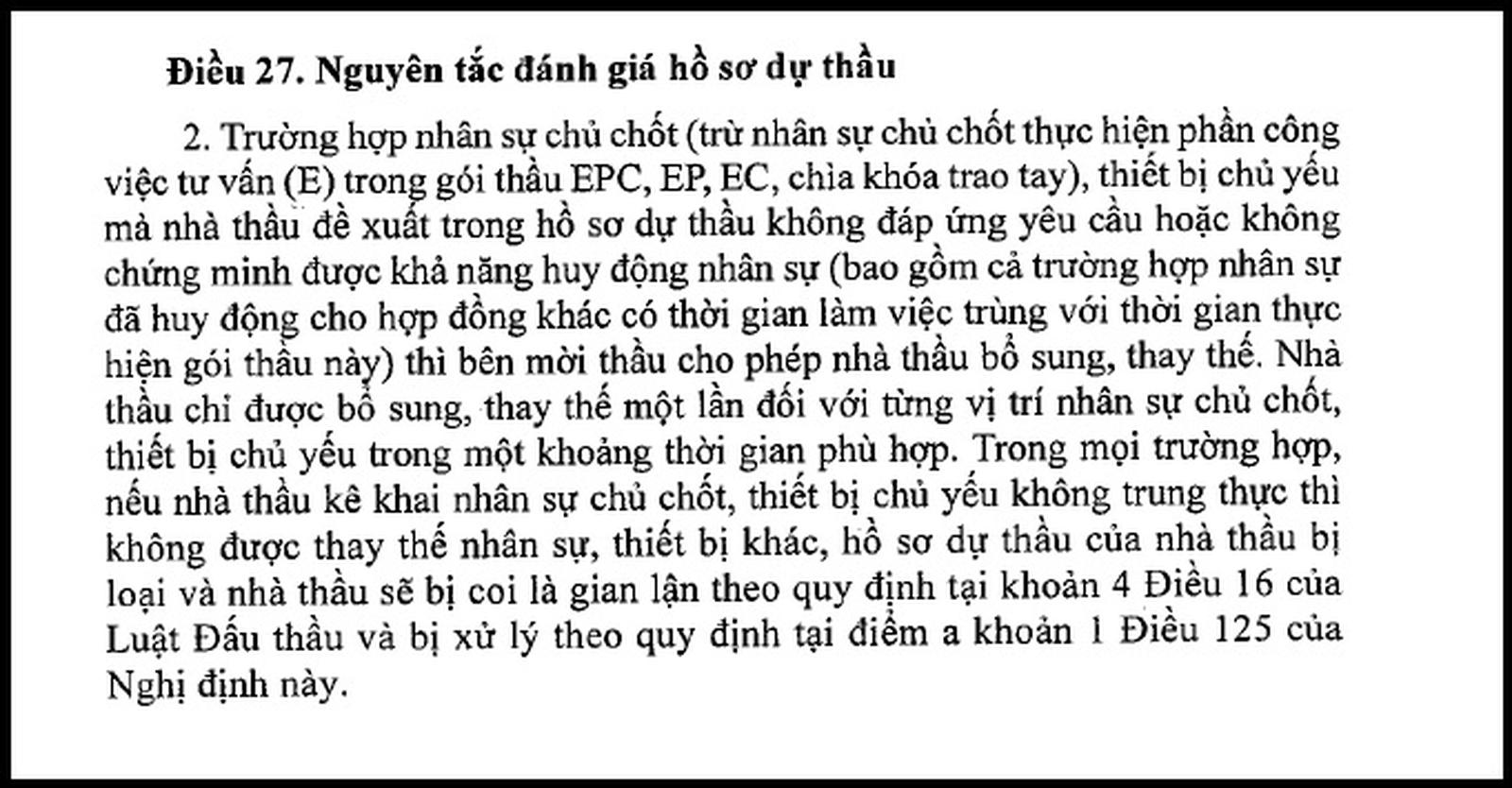 Theo khoản 2, Điều 27 Nghị định 24/2024/NĐ-CP của Chính phủ, “trong mọi trường hợp, nếu nhà thầu kê khai nhân sự chủ chốt, thiết bị chủ yếu không trung thực thì không được thay thế nhân sự, thiết bị khác, hồ sơ dự thầu của nhà thầu bị loại và nhà thầu sẽ bị coi là gian lận theo quy định tại khoản 4, Điều 16 của Luật Đấu thầu và bị xử lý theo quy định tại điểm a, khoản 1, Điều 125 của nghị định này”.