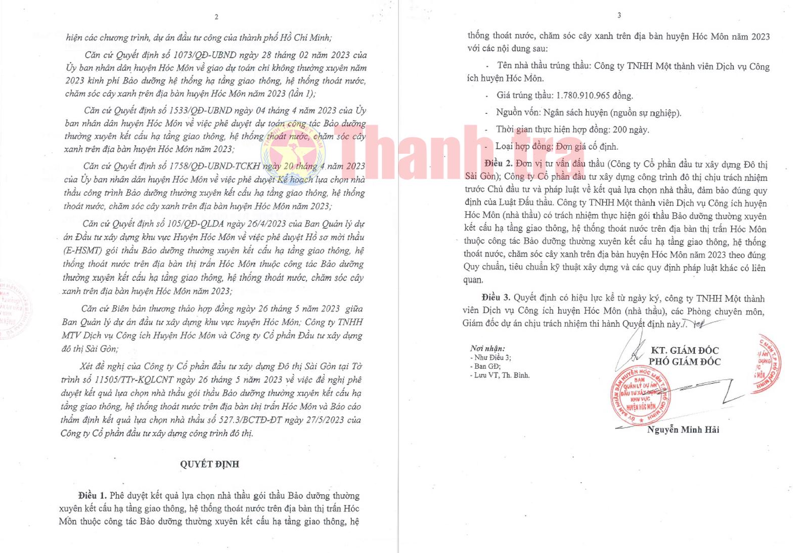 Ngày 26/5/2023, ông Nguyễn Minh Hải - Phó Giám đốc BQLDA huyện Hóc Môn đã ký quyết định phê duyệt cho công ty này trúng thầu với giá trúng thầu hơn 1,98 tỷ đồng (giá gói thầu là hơn 1,993 tỷ đồng); tiết kiệm cho ngân sách được khoảng 13 triệu đồng.