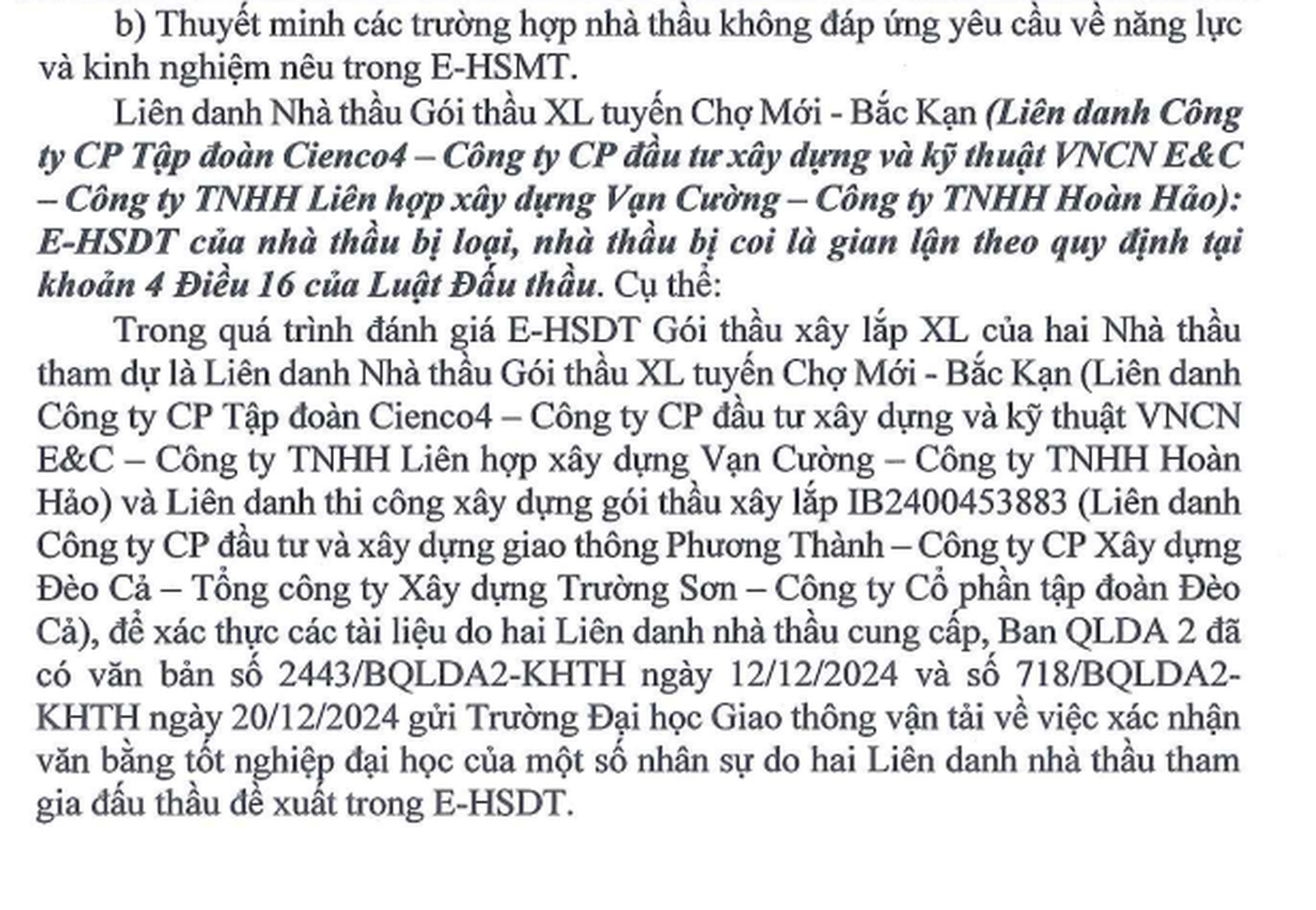 Như đã phản ánh ở kỳ báo trước, việc Liên danh Công ty CP Tập đoàn Cienco4 - Công ty CP Đầu tư xây dựng và Kỹ thuật VNCN E&C - Công ty TNHH Liên hợp xây dựng Vạn Cường - Công ty TNHH Hoàn Hảo (Công ty Hoàn Hảo), trong đó có Công ty Hoàn Hảo kê khai nhân sự Võ Hồng Thanh và 2 nhân sự khác dùng bằng tốt nghiệp đại học không có thật để dự thầu ở Gói thầu xây lắp XL - Thi công xây dựng công trình (bao gồm khảo sát, thiết kế bản vẽ thi công) thuộc Dự án Đầu tư xây dựng tuyến Chợ Mới - Bắc Kạn, tỉnh Bắc Kạn. Theo đó, đơn vị mời thầu là Ban Quản lý Dự án 2 (Bộ Xây dựng) đã đánh giá nhà thầu có hành vi kê khai nhân sự không trung thực, đồng thời bị coi là gian lận theo quy định tại khoản 4, Điều 16 Luật Đấu thầu và bị loại thầu vì vi phạm các hành vi bị cấm trong đấu thầu.