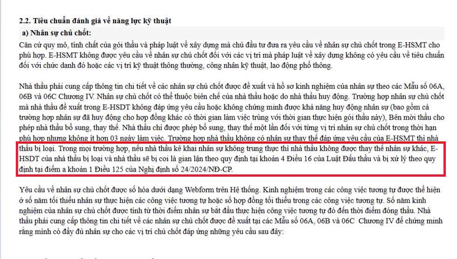 Đồng thời, đối chiếu với hồ sơ mời thầu của Ban QLDAĐT công trình giao thông Thanh Hóa thì tại Chương III quy định về “Tiêu chuẩn đánh giá E-HSDT” thì mục 2.2 quy định về “nhân sự chủ chốt” nói rất rõ ràng: “Trong mọi trường hợp, nếu nhà thầu kê khai nhân sự không trung thực thì nhà thầu không được thay thế nhân sự khác; E-HSDT của nhà thầu bị loại và nhà thầu sẽ bị coi là gian lận theo quy định tại Khoản 4, Điều 16 Luật Đấu thầu và bị xử lý theo quy định tại điểm a, khoản 1, Điều 125 của Nghị định số 24/2024/NĐ-CP". Do đó, đối chiếu với 2 quy định trên thì Công ty Hoàn Hảo sẽ không được thay thế nhân sự dùng bằng giả và đương nhiên sẽ bị loại thầu.