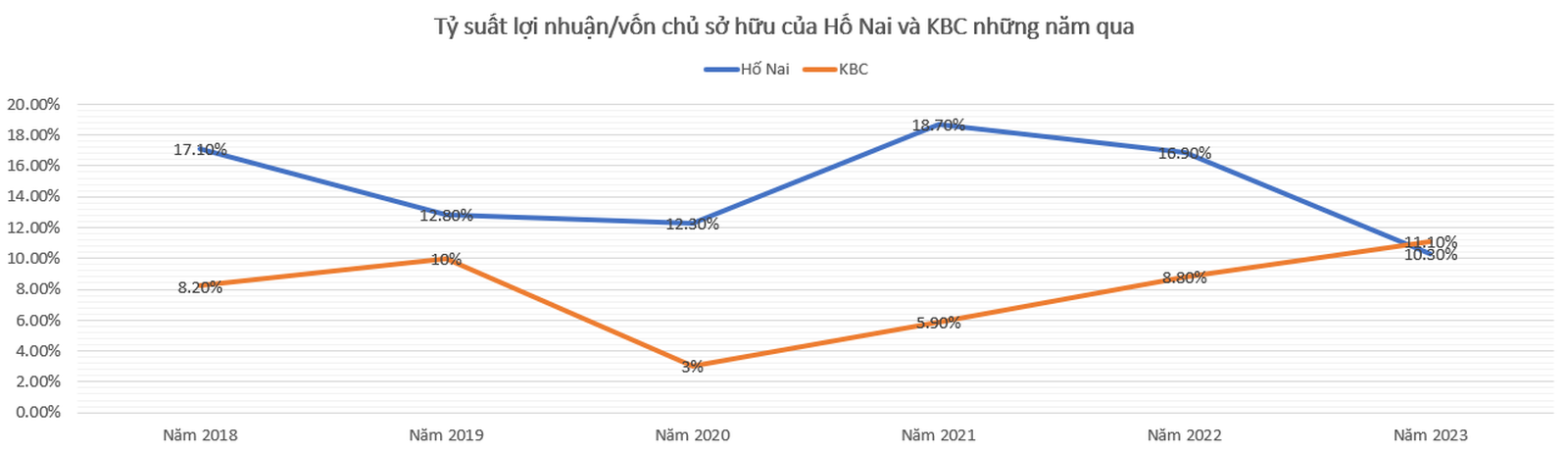 Cụ thể, tỷ suất lợi nhuận/vốn chủ sở hữu của Hố Nai trong giai đoạn 2018-2022 lần lượt là 17,1% (năm 2018), 12,8% (năm 2019), 12,3% (năm 2020), 18,7% (năm 2021) và 16,9% (năm 2022), cao hơn so với chỉ tiêu tại KBC: 8,2% (năm 2018), 10% (năm 2019), 3% (năm 2020), 5,9% (năm 2021) và 8,8% (năm 2022).