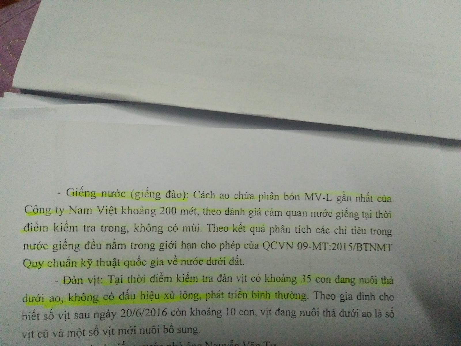 Ngày 28/10/2016, Sở TN&MT đã lấy mẫu nước giếng và nước ao nhà ông Khu theo phản ánh, cho kết quả, giếng nước nhà ông Khu không có mùi, các chỉ tiêu trong nước giếng đều nằm trong giới hạn cho phép của QCVN 09-MT: 2015? BTNMT quy chuẩn kỹ thuật quốc gia về nước dưới đất, vì vậy những gì được phản ánh trước đó đều chưa có căn cứ xác thực, nói về trách nhiệm bồi thường cho dân thì Cty Nam Việt lại càng không có lý do, bởi lẽ chất lỏng được cho là gây ô nhiễm môi trường mua từ Cty miwon Việt Nam về làm phân bón đều có hợp đồng rõ ràng, và theo Công văn phúc đáp số 1489 của Sở TN&MT Phú Thọ: Cty Miwon đang sản xuất phân bón MV-L từ bã thải lỏng dịch M2 phát sinh trong quá trình sản xuất phân bón MV-L với thành phần chủ yếu là chất hữu cơ 22%, N35%, trong quá trình hoạt động ở Phú Thọ chưa bị cơ quan chức năng nào xử phạt.