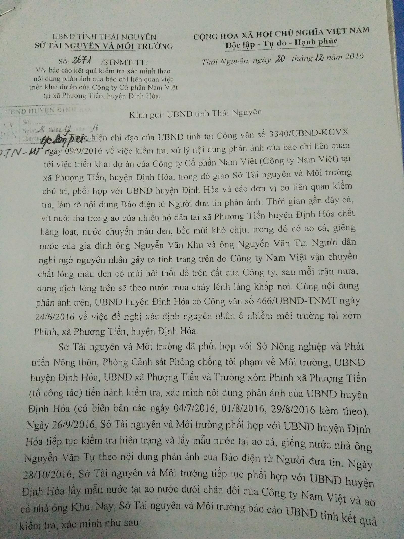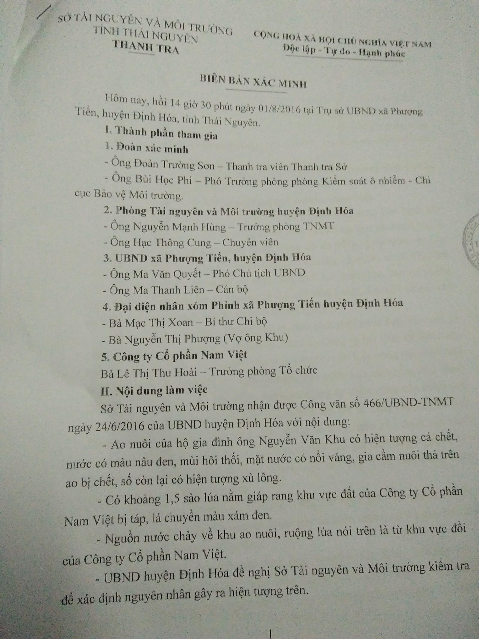 Vì theo như biên bản hiện trường xảy ra sự việc ngày 20/06/2016 được lập về hiện tượng trên giữa gia đình ông Khu, trưởng xóm và Bí thư xã cùng với các biên bản sau đó là ngày 22/06/2016 giữa hộ gia đình ông Khu và đại diện UBND xã Phượng Tiến và huyện Định Hoá về sự việc ô nhiễm được cho là do Cty Nam Việt gây ra lại không có sự hiện diện của Cty.