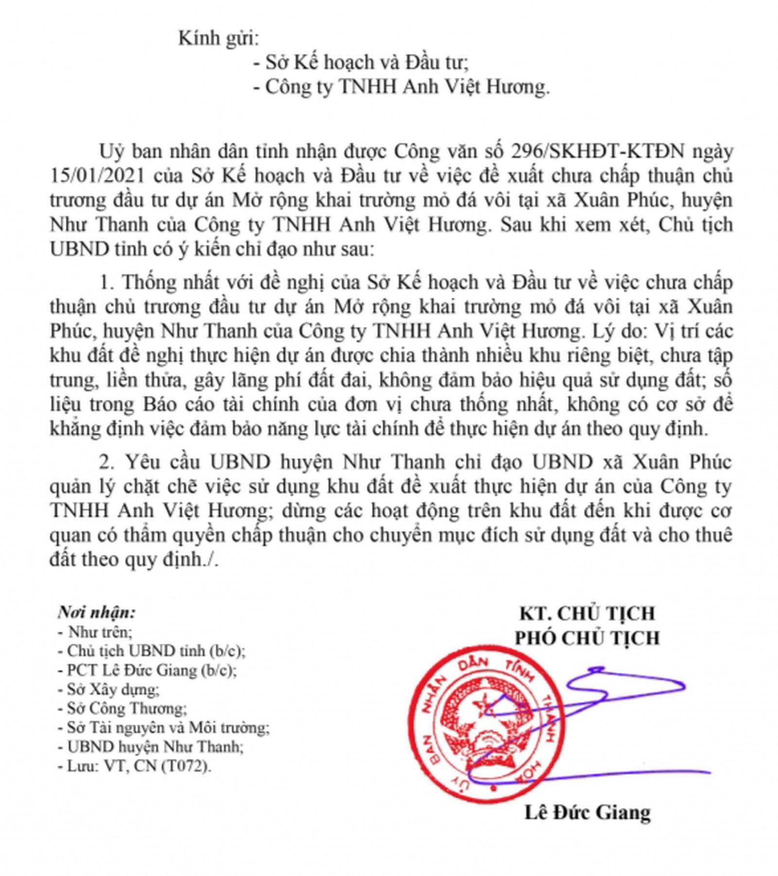Đặc biệt, ngày 21/1/2021, ông Lê Đức Giang, Phó Chủ tịch UBND tỉnh Thanh Hóa đã ký Văn bản 950/UBND-CN thông báo về việc chưa chấp thuận chủ trương mở rộng khai trường mỏ đá vôi tại xã Xuân Phúc, huyện Như Thanh của Cty Anh Việt Hương. Lý do vị trí các khu đất đề nghị thực hiện dự án chia thành nhiều khu riêng biệt, chưa tập trung liền thửa, gây lãng phí đất đai, không đảm bảo hiệu quả sử dụng đất, số liệu trong báo cáo tài chính của đơn vị chưa thống nhất, không có cơ sở để khẳng định việc đảm bảo năng lực tài chính để thực hiện dự án theo quy định.
