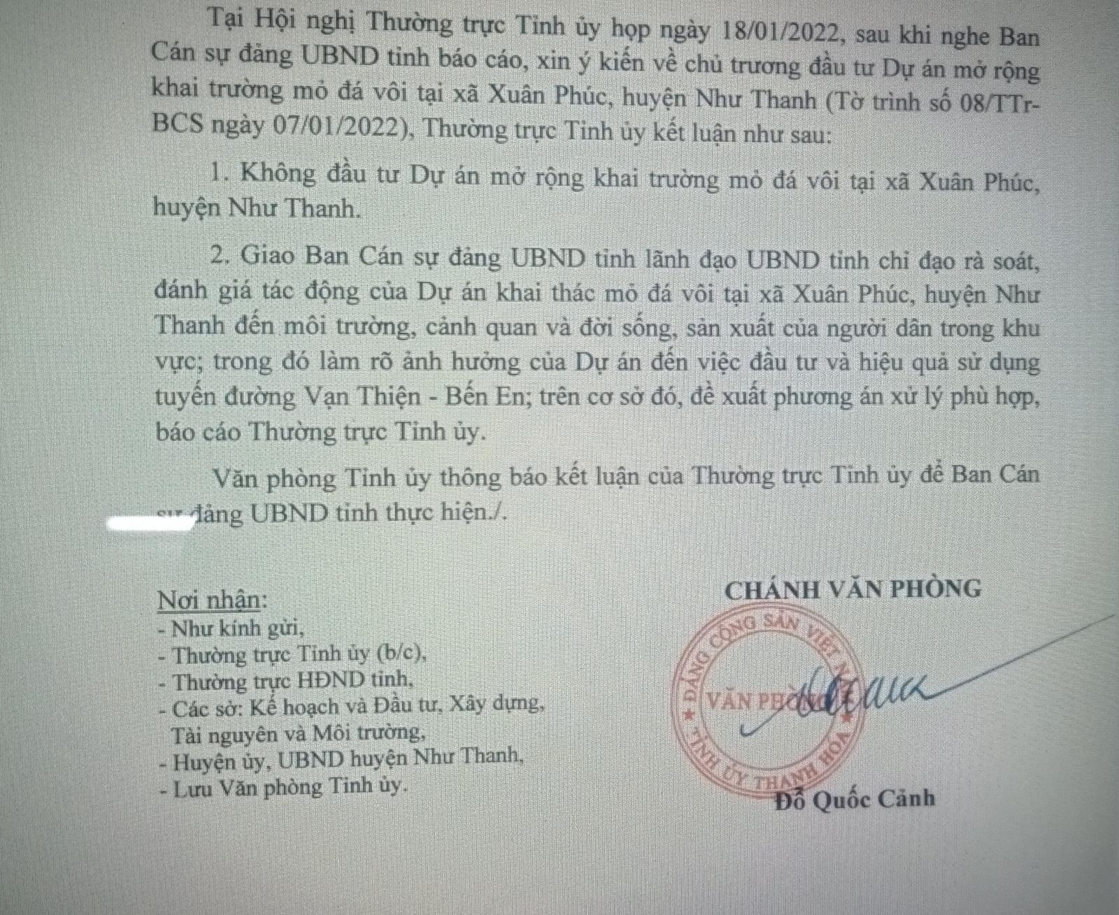 Văn bản thông báo của Thường trực Tỉnh ủy không đầu tư mở rộng khai trường khu vực mỏ đá ở xã Xuân Phúc của Cty Anh Việt Hương. Ảnh: VT