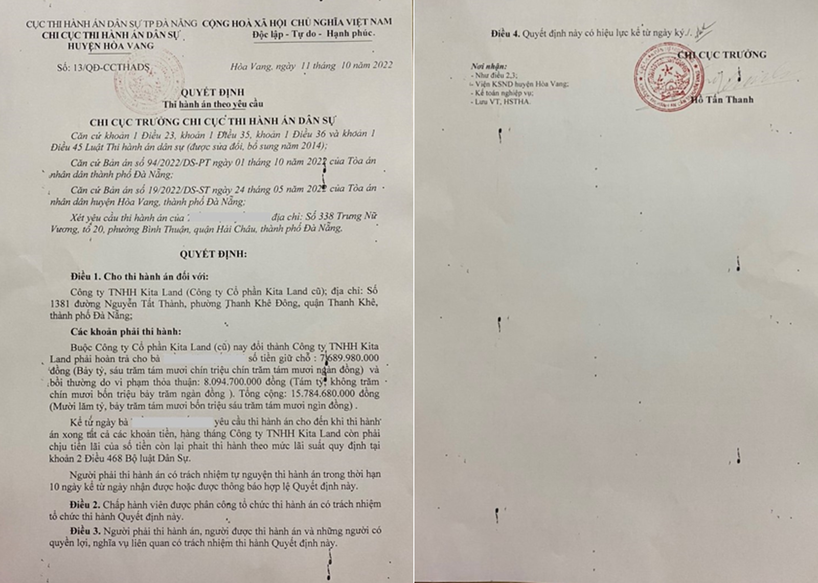 Trước đó, Chi cục Thi hành án Dân sự huyện Hòa Vang, Đà Nẵng ra Quyết định thi hành án theo yêu cầu số 13/QĐ-CCTHADS ngày 11/10/2022, buộc Cty TNHH Kita Land (tên cũ là Cty Cổ phần Kita Land, gọi tắt là Cty Kita Land) phải hoàn trả cho bà Trần Thị Tuyết Mai (trú Đà Nẵng) số tiền 15,78 tỷ đồng, bao gồm: Gần 7,7 tỷ đồng tiền đặt cọc giữ chỗ mua đất nền và gần 8,1 tỷ đồng tiền bồi thường do vi phạm thỏa thuận của các hợp đồng vay vốn, cam kết giữ chỗ nhận quyền sử dụng đất (QSDĐ) tại dự án Golden Hills City do Cty CP Trung Nam làm chủ đầu tư.