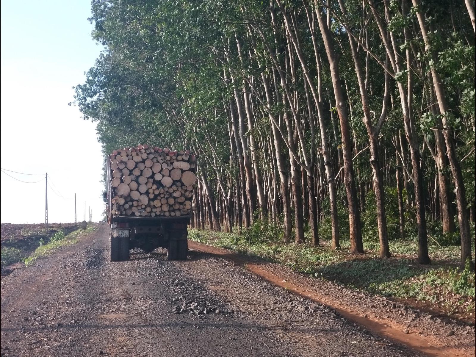 Từng đoàn xe chở gỗ cây cao su sau khi chặt rời khỏi Nông trường Yachim