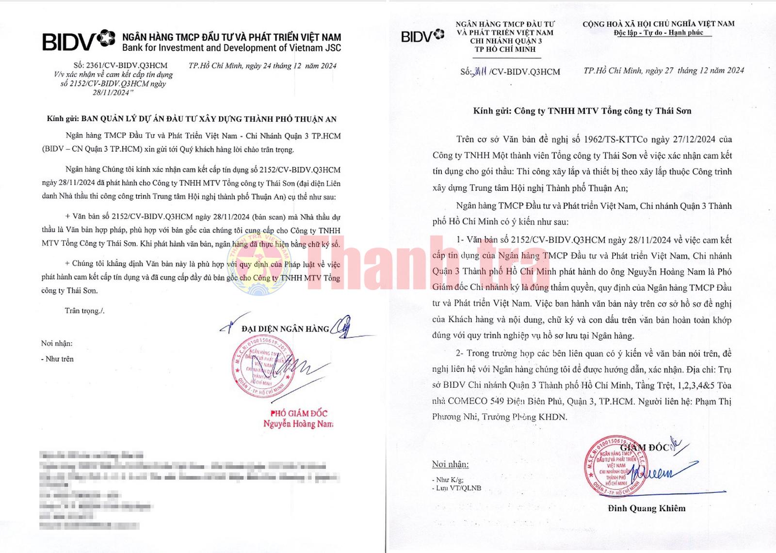 Liên quan đến văn bản cam kết tín dụng, trong ngày 27/12/2024, phía ngân hàng cũng đã có văn bản trả lời Công ty TNHH MTV Tổng Công ty Thái Sơn (văn bản này cũng được đính kèm cùng văn bản khiếu nại nêu trên). Theo đó, phía ngân hàng tiếp tục khẳng định: Văn bản số 2152/CV-BIDV.Q3HCM ngày 28/11/2024 về việc cam kết cấp tín dụng, do ông N.H.N - Phó Giám đốc Chi nhánh ký là đúng thẩm quyền, quy định của ngân hàng. Việc ban hành văn bản này trên cơ sở hồ sơ đề nghị của khách hàng và nội dung, chữ ký và con dấu trên văn bản hoàn toàn khớp đúng với quy trình nghiệp vụ hồ sơ lưu tại ngân hàng.