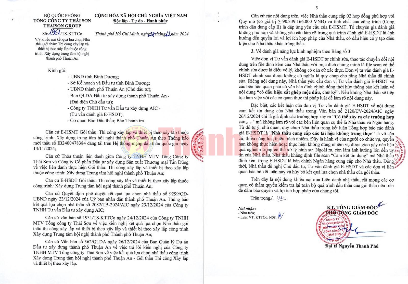 Ngày 27/12/2024, sau khi nhận được văn bản trả lời kiến nghị, Công ty TNHH MTV Tổng Công ty Thái Sơn đã có Văn bản số 1961/TS-KTTCo gửi UBND tỉnh, Sở Kế hoạch và Đầu tư tỉnh Bình Dương; UBND thành phố Thuận An, BQLDA thành phố Thuận An… để khiếu nại kết quả lựa chọn nhà thầu…