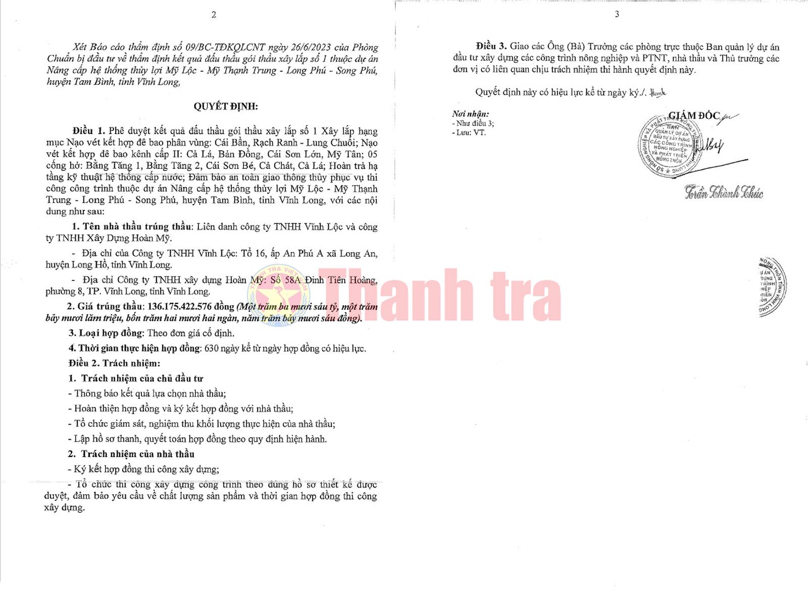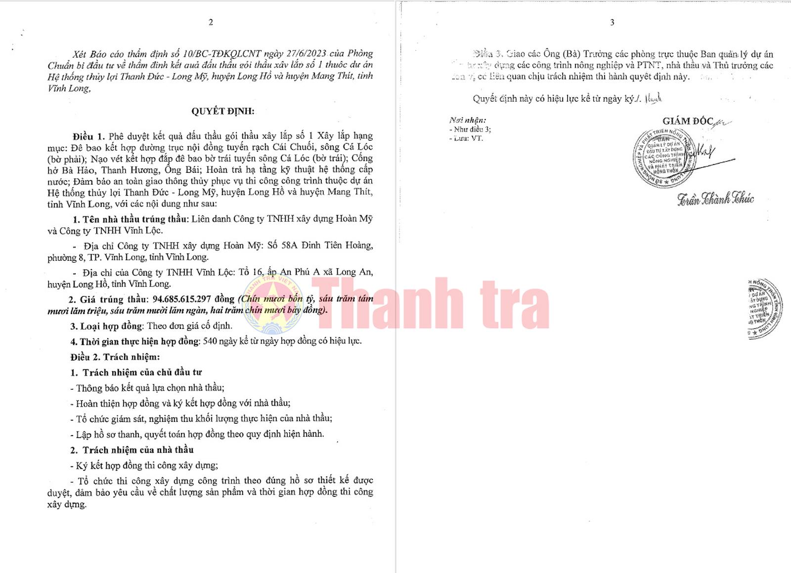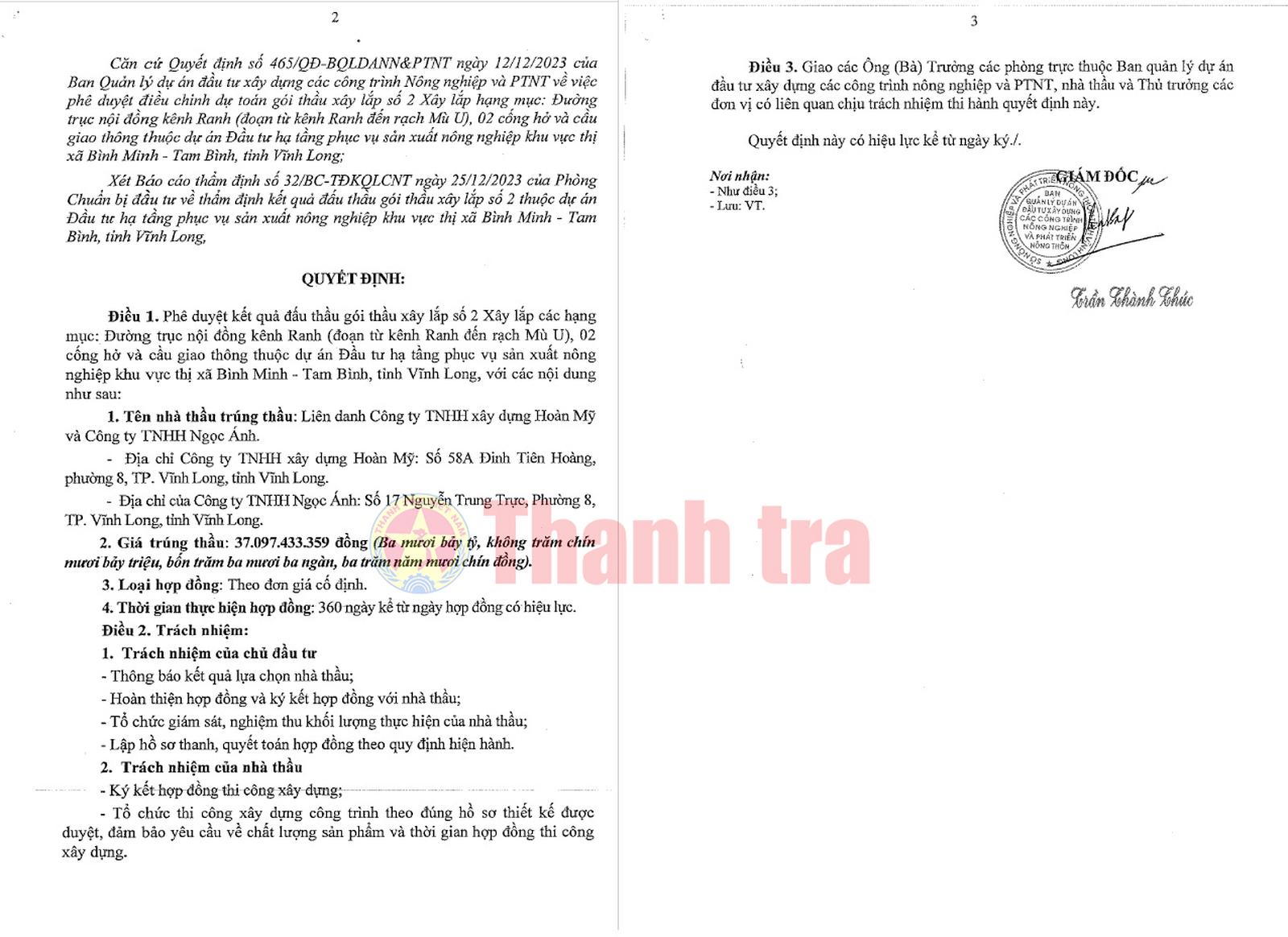 Cuối cùng, tại gói thầu xây lắp số 2: Xây lắp các hạng mục: đường trục nội đồng kênh Ranh (đoạn từ kênh Ranh đến rạch Mù U), 2 cống hở và cầu giao thông, ngày 25/12/2023, ông Trần Thành Thúc - Giám đốc Ban Quản lý dự án NN&PTNT tỉnh Vĩnh Long đã ký quyết định phê duyệt cho Liên danh Công ty TNHH Xây dựng Hoàn Mỹ và Công ty TNHH Ngọc Anh trúng thầu với giá hơn 37,097 tỷ đồng (giá gói thầu là hơn 37,224 tỷ đồng); tiết kiệm cho ngân sách được hơn 127 triệu đồng, tương đương hơn 0,34% giá gói thầu…