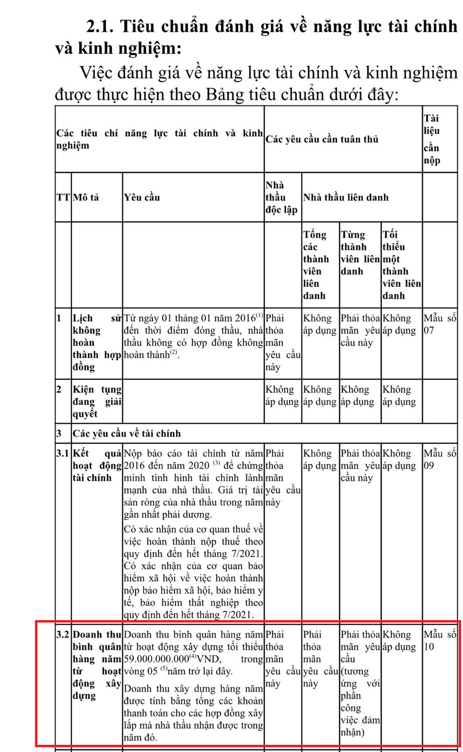 Theo yêu cầu của hồ sơ mời thầu do UBND thành phố Đồng Hới phát hành tại mục 3.2 của bảng tiêu chuẩn đánh giá về năng lực và kinh nghiệm quy định rõ doanh thu hàng năm tối thiểu của doanh nghiệp phải đạt 59 tỷ đồng trong 5 năm (2016 đến 2020).