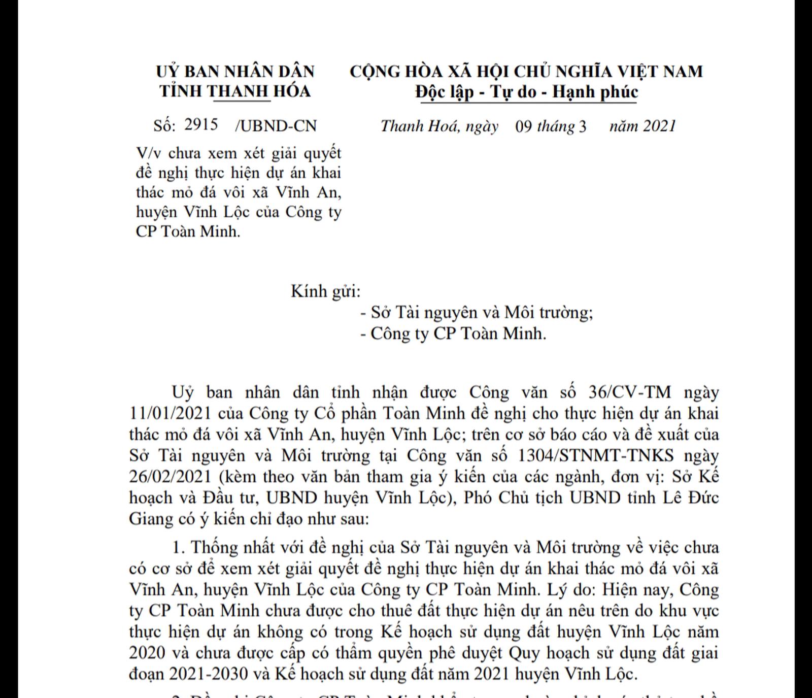 Trước những thông tin này, ông Nguyễn Trọng Trang, Chánh Văn phòng UBND tỉnh Thanh Hóa đã ký Văn bản số 2915/UBND-CN ngày 9/3/2021 truyền đạt ý kiến chỉ đạo của ông Lê Đức Giang, Phó Chủ tịch UBND tỉnh thống nhất với đề nghị của Sở Tài nguyên và Môi trường về việc chưa có cơ sở để xem xét giải quyết đề nghị thực hiện dự án khai thác mỏ đá vôi của Cty Toàn Minh vì lý do đơn vị này chưa được cấp có thẩm quyền cho thuê đất.