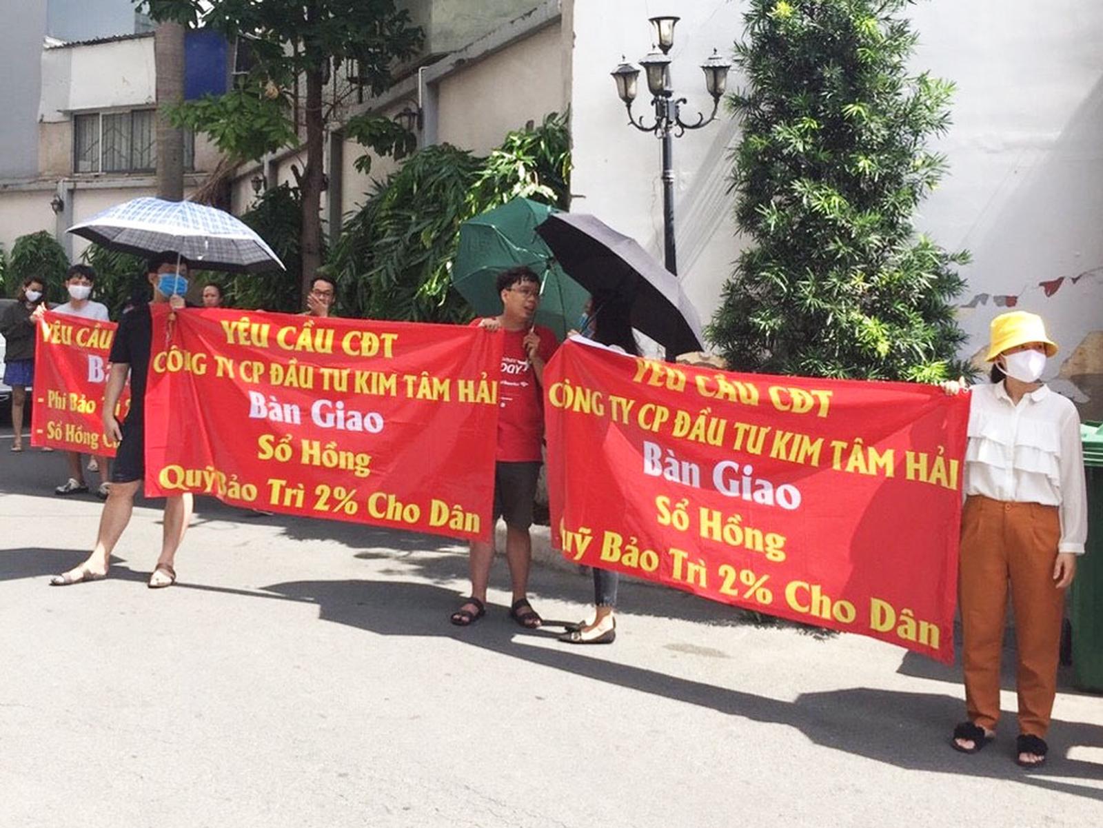 Bức xúc trước sự hứa hẹn từ năm này sang năm khác, hàng trăm cư dân chung cư Kim Tâm Hải đã phải giăng băng rôn đề nghị chủ đầu tư phải bàn giao giấy chứng nhận quyền sở hữu căn hộ và phí bảo trì 2% mà chủ đầu tư đang chiếm dụng cho ban quản trị quản lý theo đúng quy định.