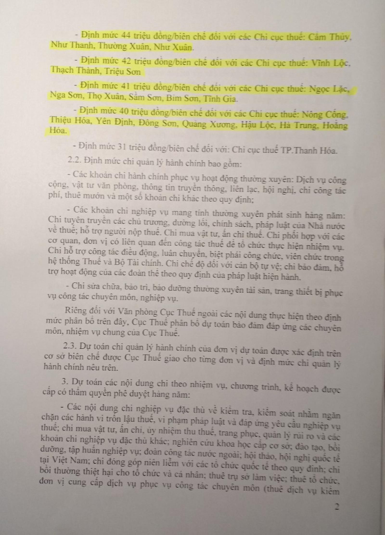 Văn bản nêu rõ định mức chi quản lý hành chính 49 triệu đồng/biên chế đối với các Chi cục Thuế huyện Mường Lát, Quan Sơn, Quan Hóa, Lang Chánh, Bá Thước; định mức 44,838 triệu đồng/biên chế đối với Văn phòng Cục Thuế; định mức 44 triệu đồng/biên chế đối với các Chi cục Thuế huyện Cẩm Thủy, Như Thanh, Thường Xuân, Như Xuân; định mức 42 triệu đồng/biên chế đối với các Chi cục Thuế huyện Ngọc Lặc, Nga Sơn, Thọ Xuân, Sầm Sơn, Bỉm Sơn, Tĩnh Gia; định mức 40 triệu đồng/biên chế đối với Chi cục Thuế huyện Nông Cống, Thiệu Hóa, Yên Định, Đông Sơn, Quảng Xương, Hậu Lộc, Hà Trung, Hoằng Hóa; định mức 31 triệu đồng/biên chế đối với Chi cục Thuế TP Thanh Hóa.
