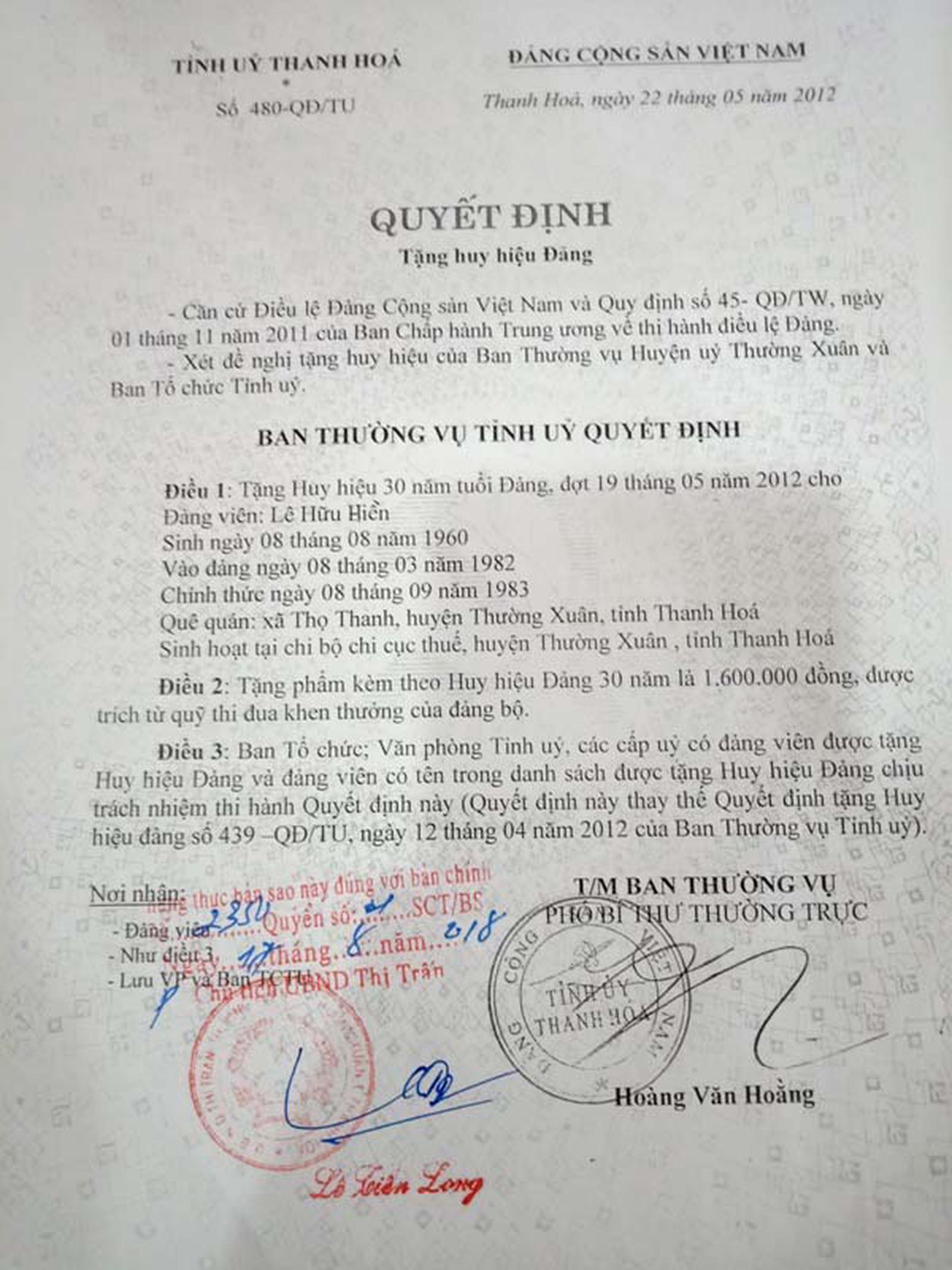 Quyết định tặng Huy hiệu 30 năm tuổi Đảng cho ông Hiền của Ban Thường vụ Tỉnh ủy Thanh Hóa cũng thể hiện ông Hiền sinh ngày 8/8/1960