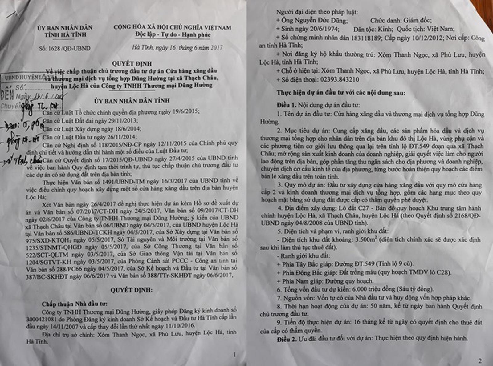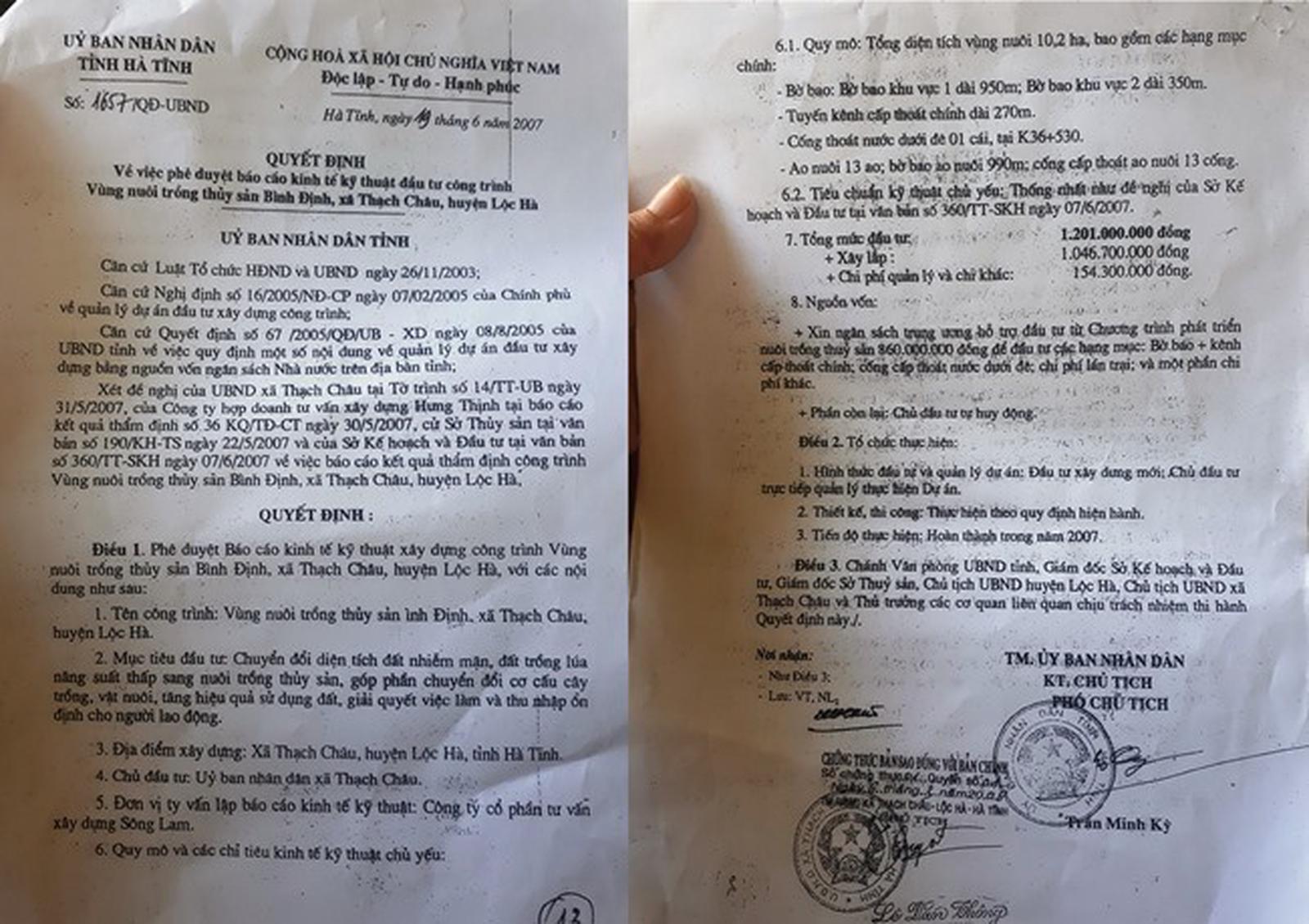 Quyết định số 1628/QĐ-UBND của tỉnh Hà Tĩnh về việc chấp thuận chủ trương đầu tư dự án cửa hàng xăng dầu và thương mại dịch vụ tổng hợp Dũng Hường tại xã Thạch Châu, huyện Lộc Hà đã xác định phạm vi ranh giới khu đất. Diện tích dự án 3.500 m2 thuộc lô đất C27 có ranh giới phía Tây Bắc giáp đường ĐT.549, phía Đông Bắc giáp đất trồng màu, phía Nam giáp đường quy hoạch, nhưng phần ranh giới giáp vùng nuôi trồng thủy sản của 6 hộ dân bỗng dưng “biến mất” không được nhắc đến.