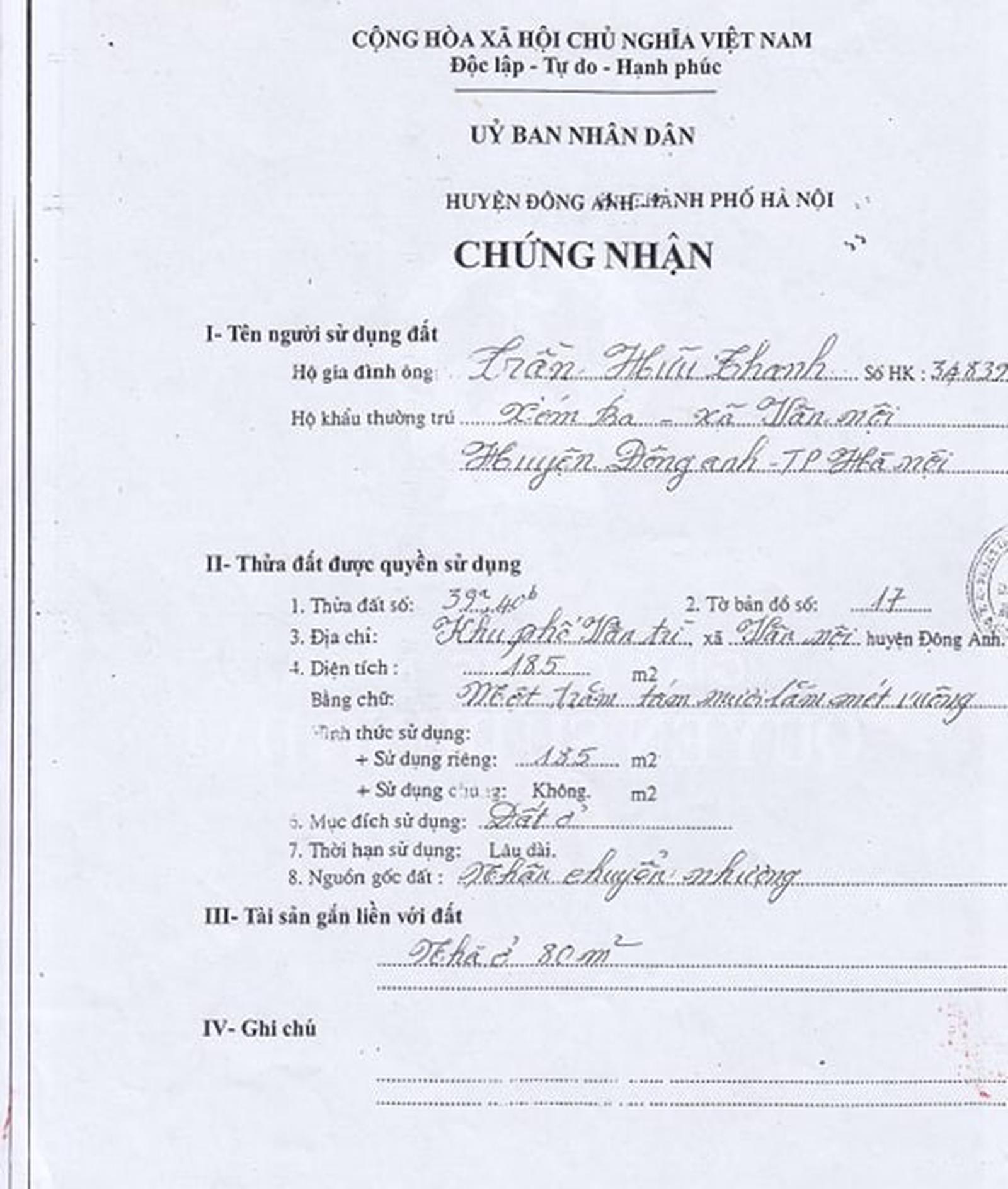 Theo Giấy chứng nhận quyền sử dụng đất số AD556401 của UBND huyện Đông Anh cấp cho ông Trần Hữu Thanh tại thửa đất số 39a, 40b thuộc tờ bản đồ địa chính xã số 17 thì thửa này có diện tích 185m2 với mục đích sử dụng là đất ở, trên đó đã có nhà ở rộng 80 m2. Tại thời điểm Sở Công thương Hà Nội cấp Giấy chứng nhận đủ điều kiện bán lẻ xăng dầu tại cửa hàng xăng dầu số 57 Vân Trì, thì mục đích sử dụng đất vẫn đang là đất ở.