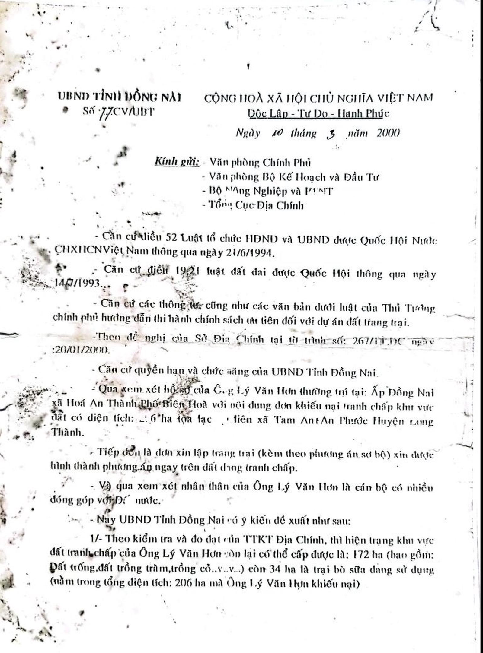 Trong đó, Công văn 77/CV/UBT-UBND tỉnh Đồng Nai nêu rõ, hiện trạng khu vực đất tranh chấp của cụ Lý Văn Hơn còn lại có thể cấp là 172 ha bao gồm: Đất trồng, đất trồng tràm, đất trồng cỏ... 34 ha còn lại là trại bò sữa đang sử dụng, khu đất này nằm trong 206 ha đất tranh chấp mà cụ Lý Văn Hơn khiếu nại trước đó nhiều năm.
