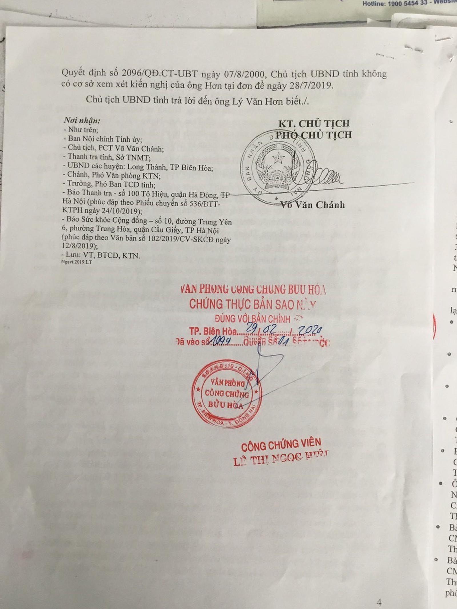 Theo tìm hiểu của chúng tôi, tháng 2/1995, Tổng Công ty Cao su Việt Nam có Công văn số 95/CSĐN gửi UBND tỉnh Đồng Nai, Sở Địa chính tỉnh Đồng Nai, UBND huyện Long Thành với nội dung “trao trả lại 22,04 ha đất cho chủ cũ” vì diện tích không nằm trong quy hoạch, yêu cầu cụ Lý Văn Hơn liên hệ với cơ quan có thẩm quyền làm thủ tục nhận lại quyền sử dụng đất cho gia đình.