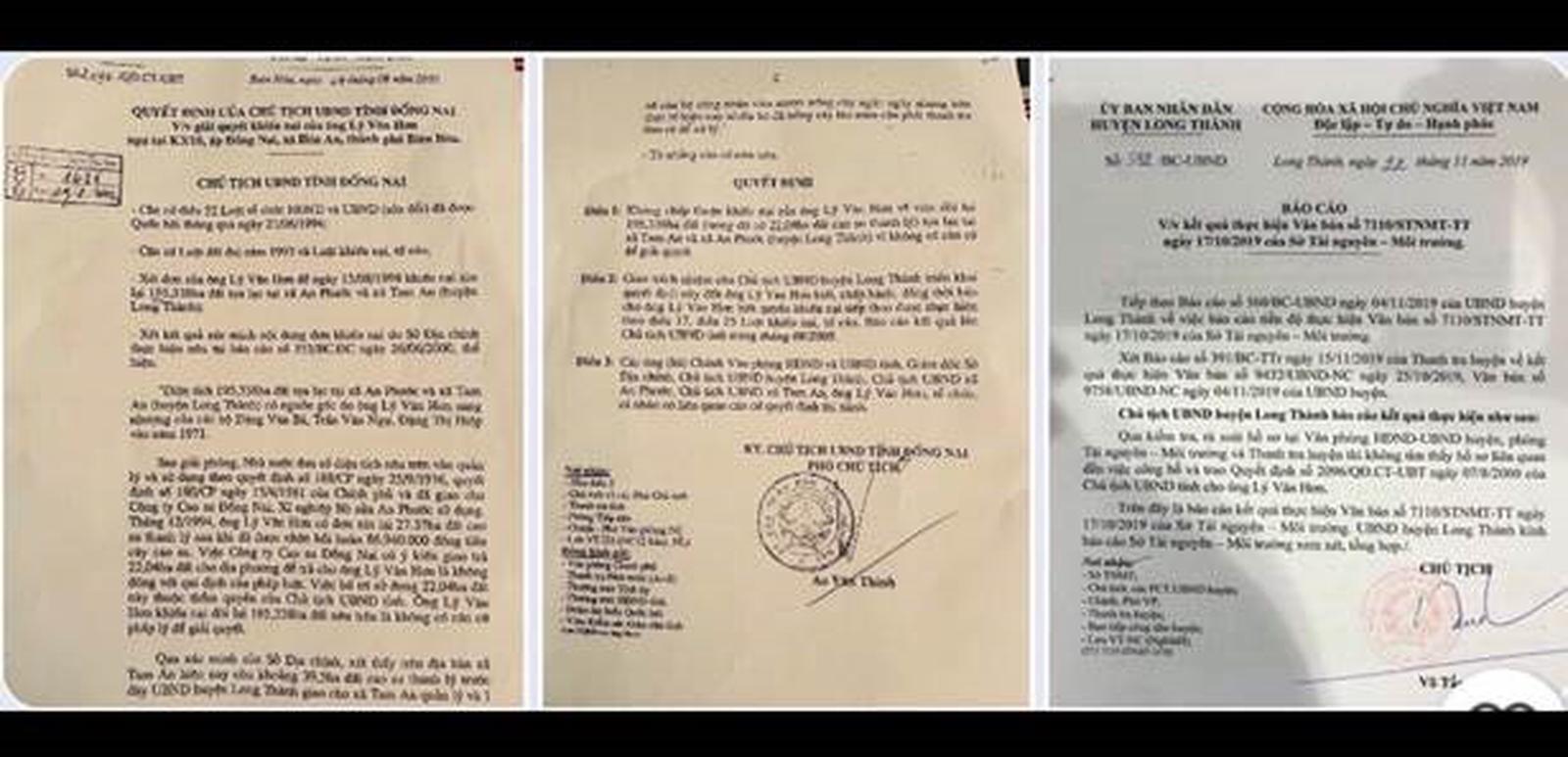 Trước đó, năm 1992, cụ Hơn có viết đơn trình UBND huyện Long Thành, Phòng Quản lý ruộng đất, UBND xã An Lợi, UBND xã Tam An xác nhận 22,04 ha đất tại hai địa phương trên đều do cụ làm chủ sở hữu.
