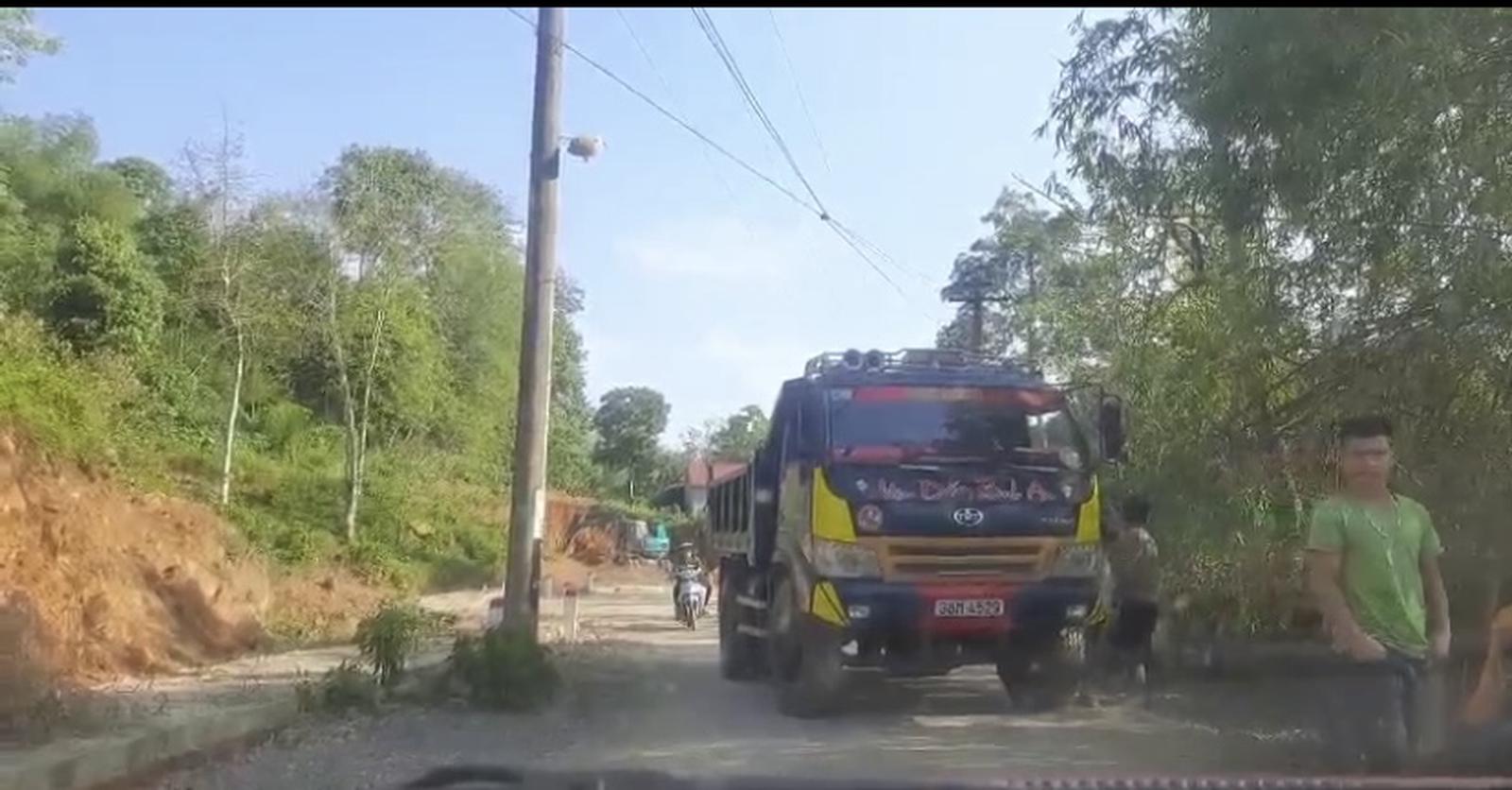 Một số xe tải đang chờ trên đường tại vị trí máy xúc khai thác để vận chuyển. Ảnh: Hương Trà