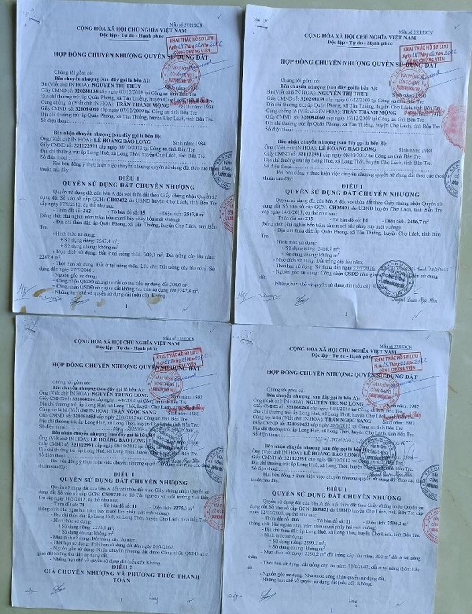 Sau khi lấy được GCNQSDĐ từ ngân hàng về, ngày 15/7/2020, tại Văn phòng Công chứng Huỳnh Đoàn Ngọc Hân (ấp Bình An B, thị trấn Chợ Lách), hai bên đã ký 4 hợp đồng chuyển nhượng QSDĐ. Ông Bảo Long mua lại 4 thửa đất trên của vợ chồng ông Trung Long, ông Mộng, bà Thủy.