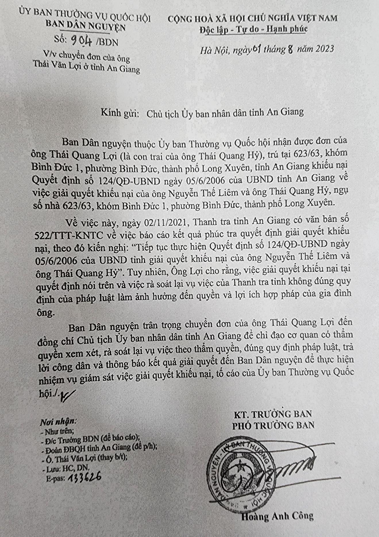 Ban Dân nguyện của Ủy ban Thường vụ Quốc hội đã có văn bản gửi Chủ tịch UBND tỉnh An Giang đề nghị chỉ đạo cơ quan có thẩm quyền xem xét, rà soát lại vụ việc