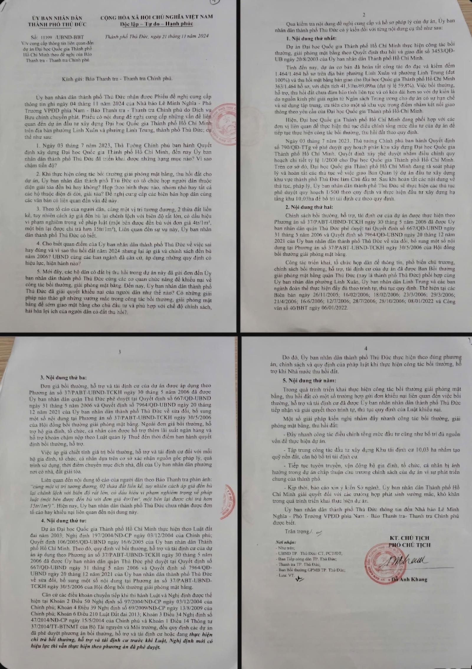 Liên quan đến những nội dung phản ánh về công tác bồi thường giải phóng mặt bằng Dự án xây dựng Đại học Quốc gia Thành phố Hồ Chí Minh tại thành phố Thủ Đức (Thành phố Hồ Chí Minh), ngày 21/11/2024, ông Đỗ Anh Khang - Phó Chủ tịch UBND thành phố Thủ Đức đã ký Công văn số 11399/UBND-BBT về việc cung cấp thông tin theo đề nghị của PV Báo Thanh tra.