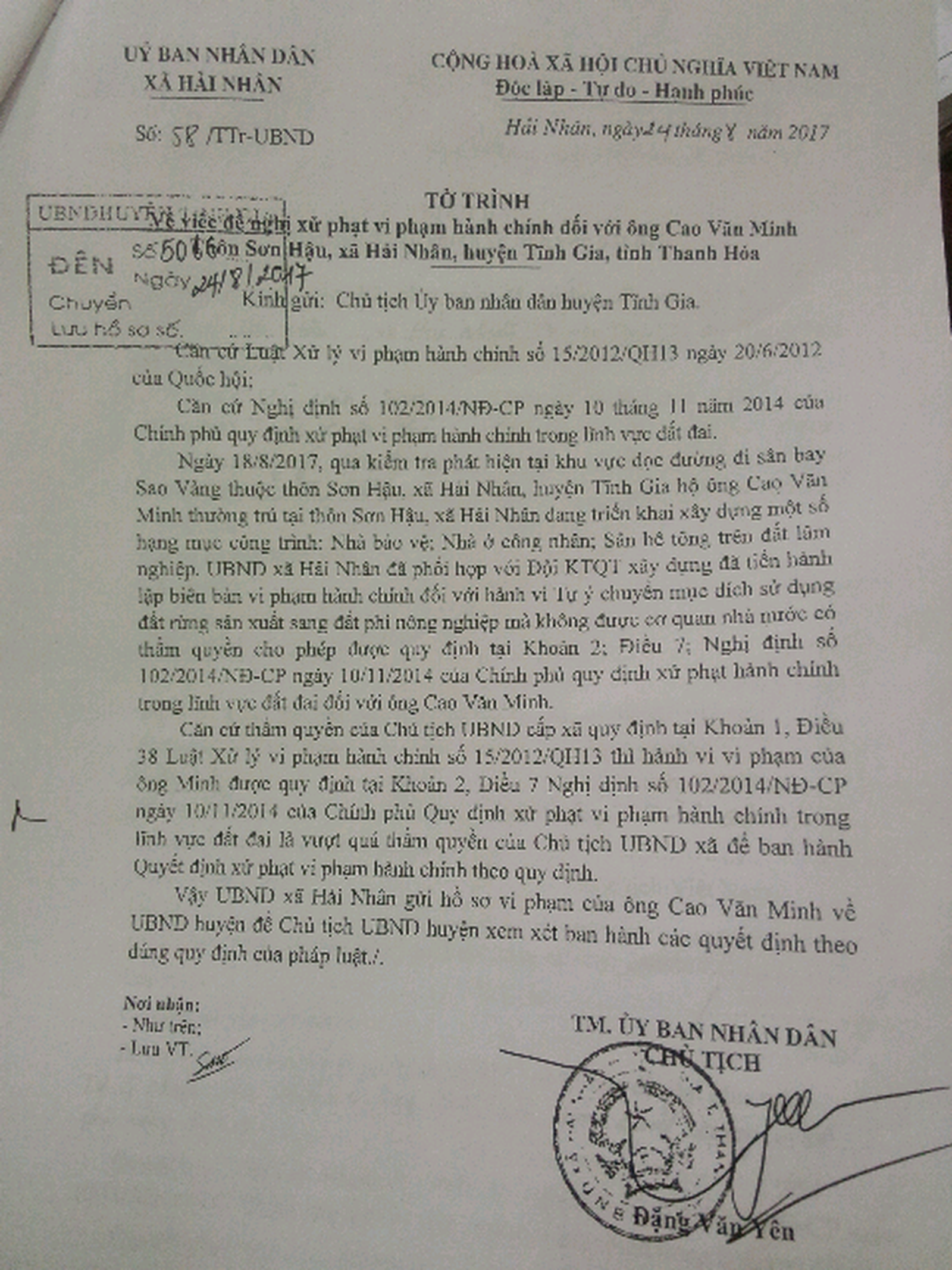 Ngày 21/9/2017, UBND huyện Tĩnh Gia có Văn bản 2317/UBND-QTXD gửi Chủ tịch UBND xã Hải Nhân, trong đó ghi rõ: Theo báo cáo của Đội Kiểm tra quy tắc xây dựng, hiện nay, ông Cao Văn Minh vẫn không thực hiện việc nộp phạt vi phạm hành chính, đồng thời còn cố tình hoàn thiện công trình đưa vào sử dụng. Việc để xảy ra vi phạm nêu trên trách nhiệm thuộc về UBND xã Hải Nhân, đứng đầu là Chủ tịch UBND xã không kiểm tra, phát hiện và có biện pháp xử lý, ngăn chặn hành vi vi phạm kịp thời.