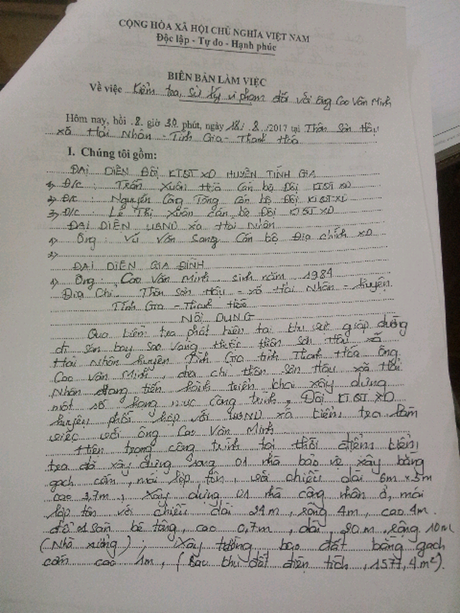 Tại tờ trình của UBND xã Hải Nhân (Tĩnh Gia), ngày 18/8/2017, qua kiểm tra, phát hiện tại khu vực dọc đường đi sân bay Sao Vàng thuộc thôn Sơn Hậu có hộ ông Cao văn Minh (ở thôn Sơn Hậu) đang xây dựng một số hạng mục công trình: Nhà bảo vệ, nhà ở công nhân, sân bê tông, tường rào trên đất lâm nghiệp.