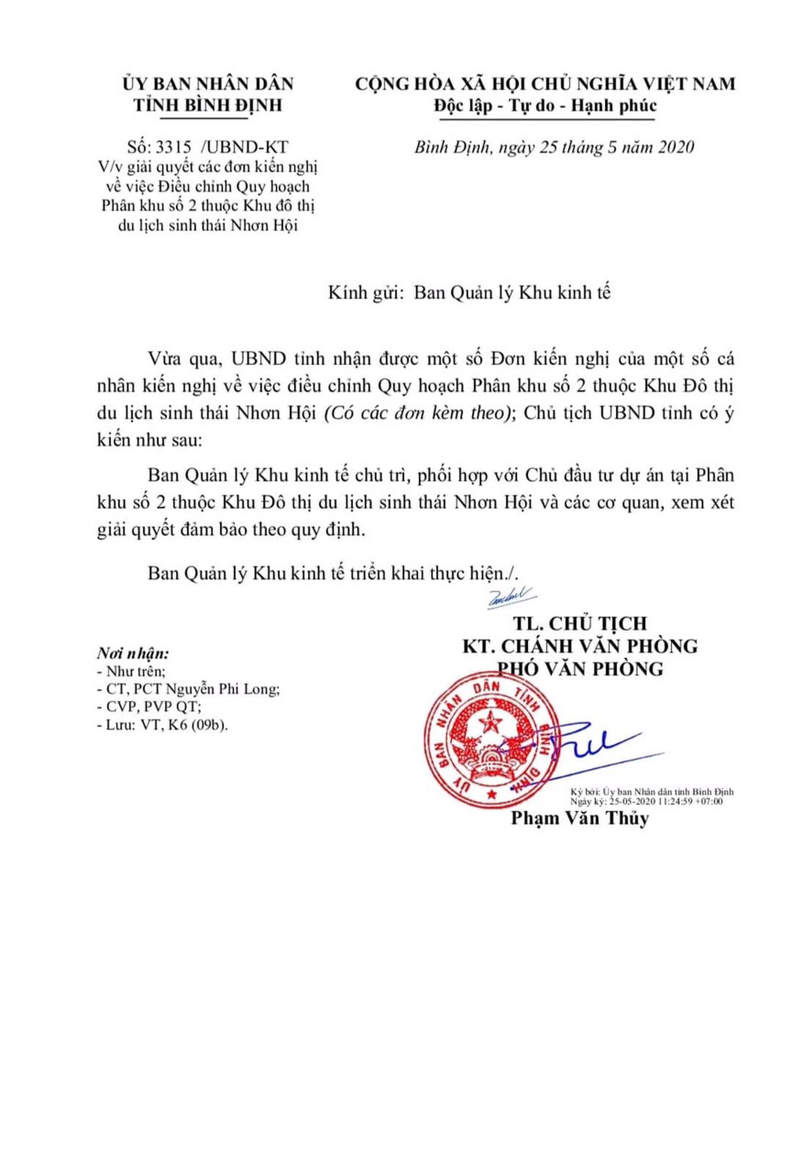 Văn bản của UBND tỉnh Bình Định tiếp nhận đơn phản ánh về việc điều chỉnh quy hoạch Phân khu 2 D.A KĐT Du lịch sinh thái Nhơn Hội 2 chuyển Ban Quản lý Khu Kinh tế để xem xét, giải quyết