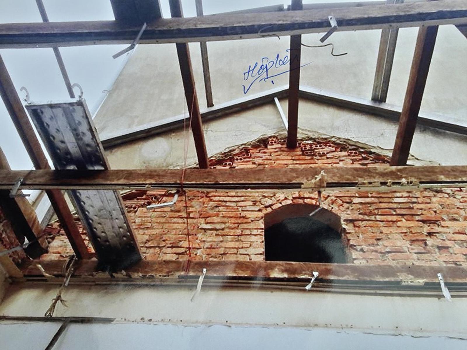 Dấu vết tường cũ và tường mới, mái cũ và mái mới thể hiện khá rõ của việc xây thêm tường và nâng độ cao của mái. Ảnh: PV