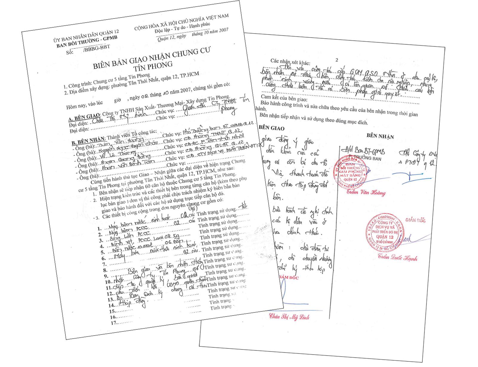 Ngày 2/10/2007, các bên đã ký biên bản giao nhận Chung cư Tín Phong theo đúng quy định của pháp luật. Cty Tín Phong đã bàn giao toàn bộ 60 căn hộ chung cư cùng toàn bộ thiết bị PCCC, hồ sơ nghiệm thu PCCC cho Ban bồi thường và Cty Công ích quận 12, đồng thời các bên cùng thống nhất: “Cty Tín Phong sẽ tiếp tục quản lý, bảo quản cho đến khi UBND quận 12 thành lập Ban Quản trị chung cư” và “tầng hầm thuộc quyền sở hữu của Cty Tín Phong”.