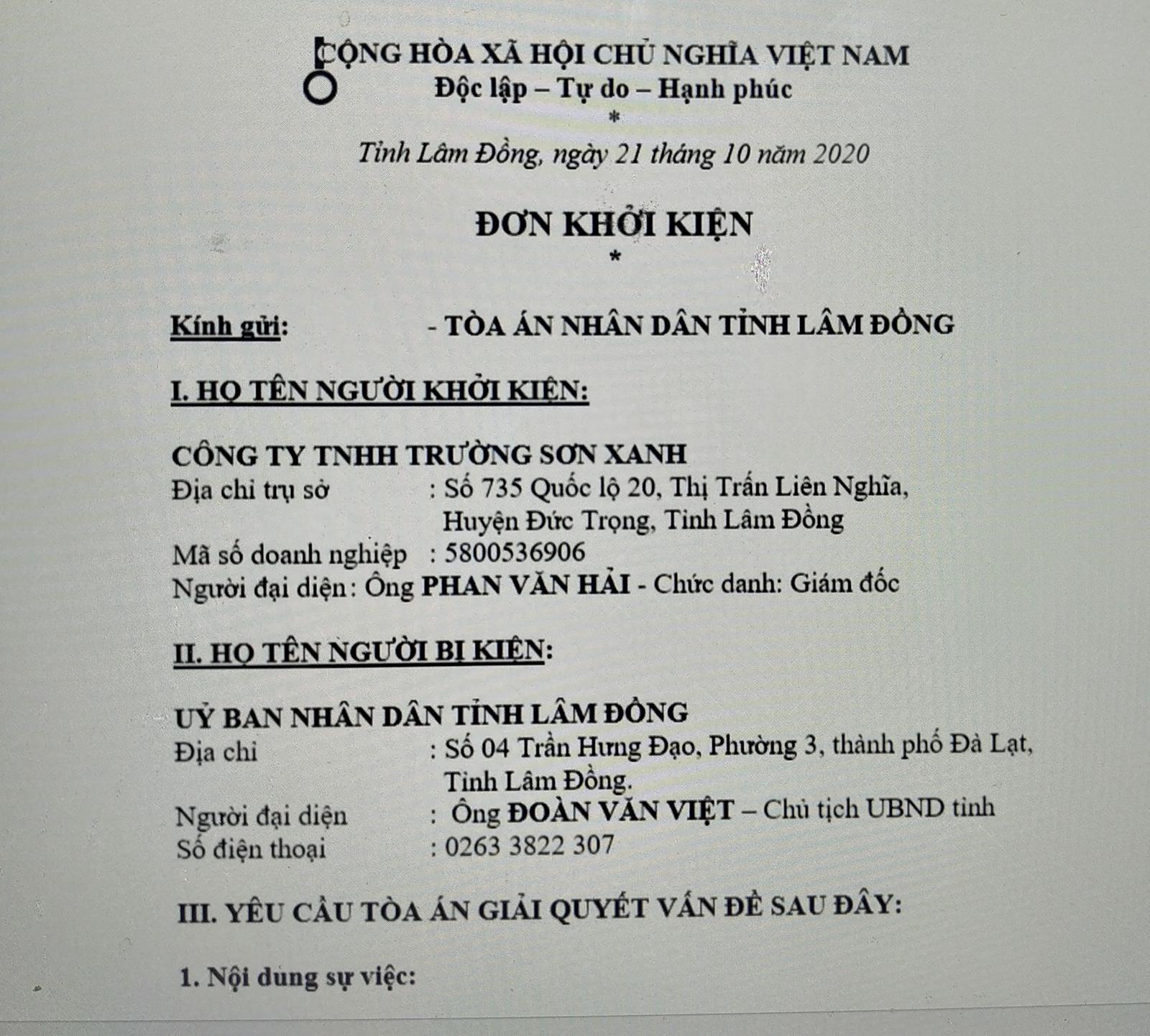 Ông Hải cũng cho biết, liên quan tới quyết định của tỉnh, doanh nghiệp đã có đơn khởi kiện UBND tỉnh Lâm Đồng. Ngày 23/10, TAND tỉnh Lâm Đồng cũng đã nhận đơn.