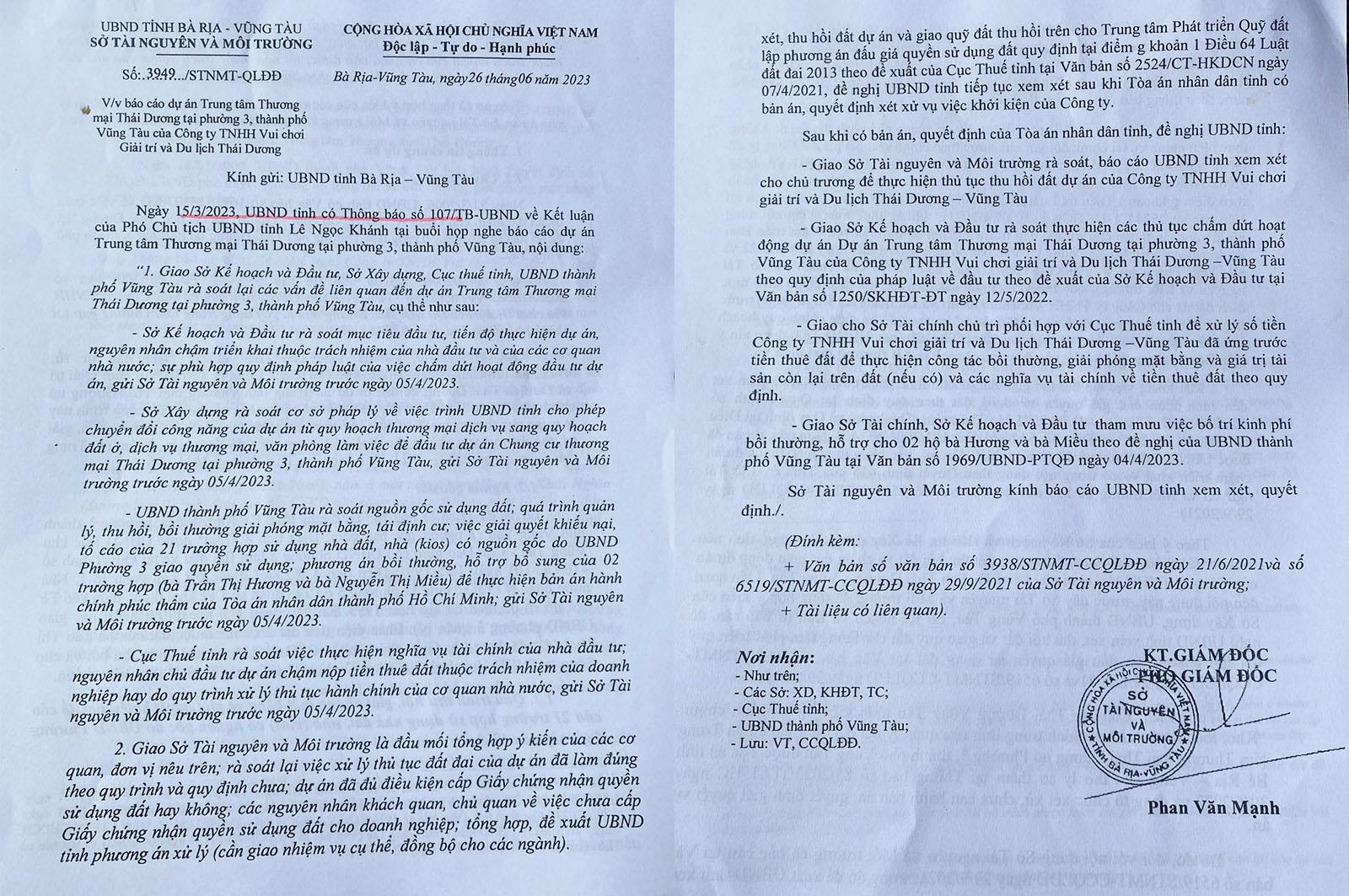 Văn bản của Sở TN&MT gửi UBND tỉnh Bà Rịa - Vũng Tàu báo cáo về Dự án Trung tâm Thương mại Thái Dương. Ảnh: CN