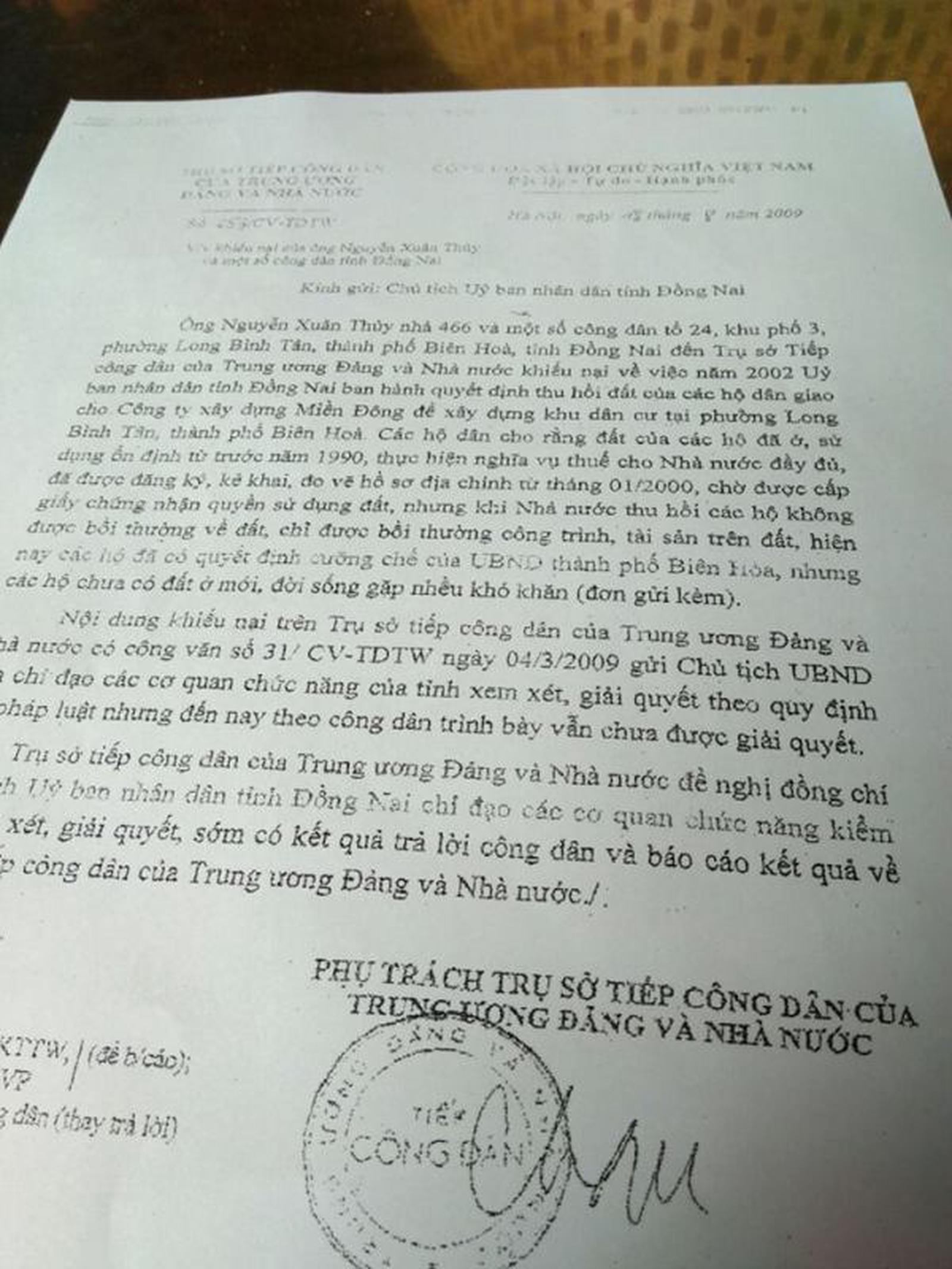 Ngày 4/3/2009, Trụ sở Tiếp công dân của Trung ương Đảng và Nhà nước có Công văn số 31/CV-TDTW gửi Chủ tịch UBND tỉnh Đồng Nai chỉ đạo các cơ quan chức năng của tỉnh xem xét, giải quyết theo quy định của pháp luật.