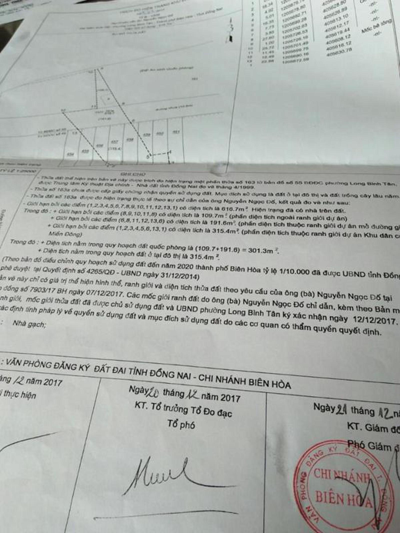 Ngày 21/12/2017, Văn phòng Đăng ký đất đai tỉnh Đồng Nai (Chi nhánh Biên Hòa) xác nhận đất hợp pháp, không lấn chiếm, sử dụng đúng hiện trạng.