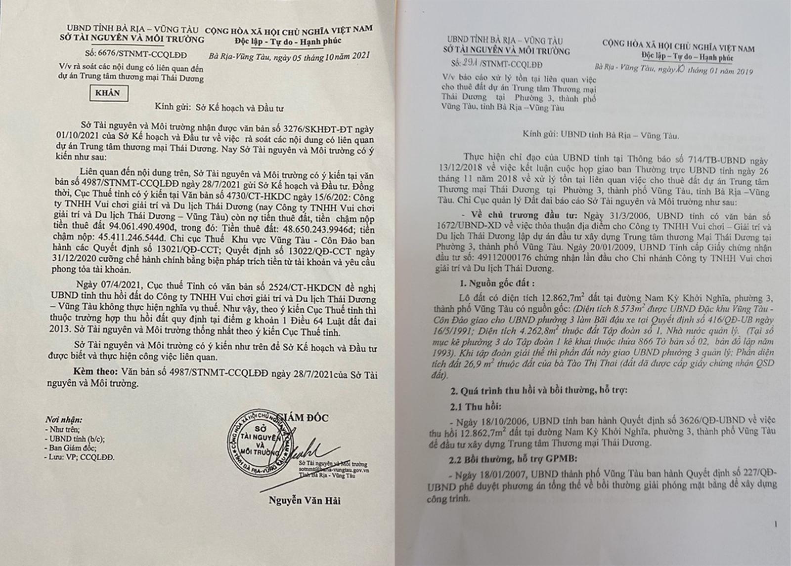 Ngày 5/10/2021, Sở Tài nguyên và Môi trường (TN&MT) tỉnh Bà Rịa - Vũng Tàu đã có Công văn số 6676/STNMT-CCQLĐĐ gửi Sở Kế hoạch và Đầu tư về việc rà soát các nội dung có liên quan đến Dự án Trung tâm Thương mại Thái Dương. Tại văn bản này, Sở TN&MT thống nhất với ý kiến của Cục Thuế tỉnh Bà Rịa - Vũng Tàu về việc đề nghị UBND tỉnh thu hồi đất do chủ đầu tư Dự án Trung tâm Thương mại Thái Dương không thực hiện nghĩa vụ thuế.