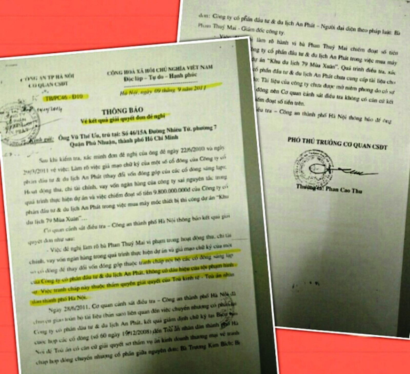 Đến giữa năm 2010, bà Bích cùng ông Ưu làm nhiều đơn tố cáo bà Phan Thúy Mai “làm giả các hợp đồng tín dụng, làm giả chữ ký trên điều lệ Cty, làm giả các biên bản họp HĐQT, sử dụng trái phép tài sản của Cty để mua bán cổ phần kiếm lời, góp vốn khống, tự xuất hóa đơn mua 2 nền biệt thự trong “Dự án đồi 79 Mùa xuân” mà không được phê chuẩn của HĐQT và ĐHĐCĐ…”. Sau hơn 1 năm điều tra, cơ quan CSĐT – Công an TP Hà Nội có Thông báo số 35/TB/PC46-Đ10 ngày 9/9/2011 khẳng định, “tranh chấp nội bộ của các cổ đông sáng lập Cty CP đầu tư và du lịch An Phát không có dấu hiệu của tội phạm hình sự. Việc tranh chấp này thuộc thẩm quyền giải quyết của Tòa Kinh tế - TAND TP Hà Nội.” Nguyên đơn khởi kiện đến TAND TP Hà Nội theo đúng hướng dẫn của cơ quan CSĐT – Công an Hà Nội và Tòa án Hà Nội đã thụ lý giải quyết vụ việc.