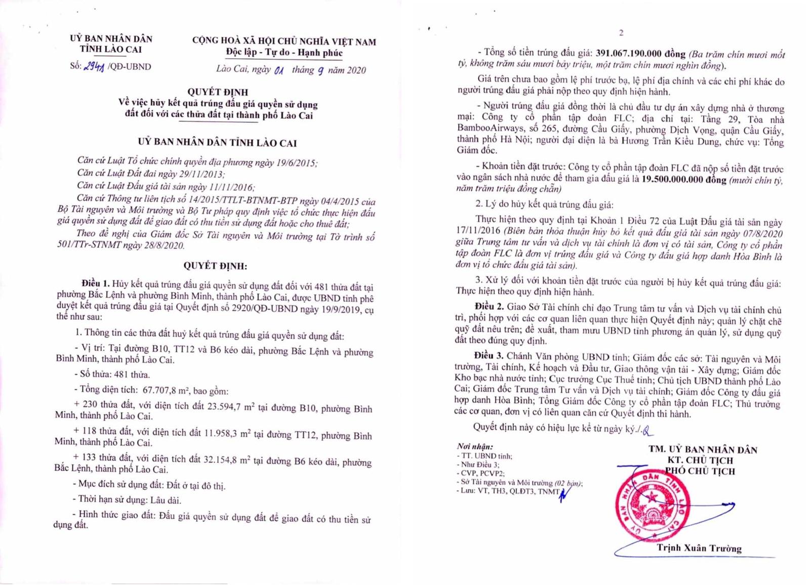 Đến ngày 1/9/2020, Chủ tịch UBND tỉnh Lào Cai đã ký Quyết định số 2948/QĐ-UBND về việc hủy kết quả trúng đấu giá quyền sử dụng đất đối với 481 thửa đất tại phường Bắc Lệnh và phường Bình Minh, thành phố Lào Cai, được UBND tỉnh phê duyệt kết quả trúng đấu giá tại Quyết định số 2920/QĐ-UBND ngày 19/9/2019.