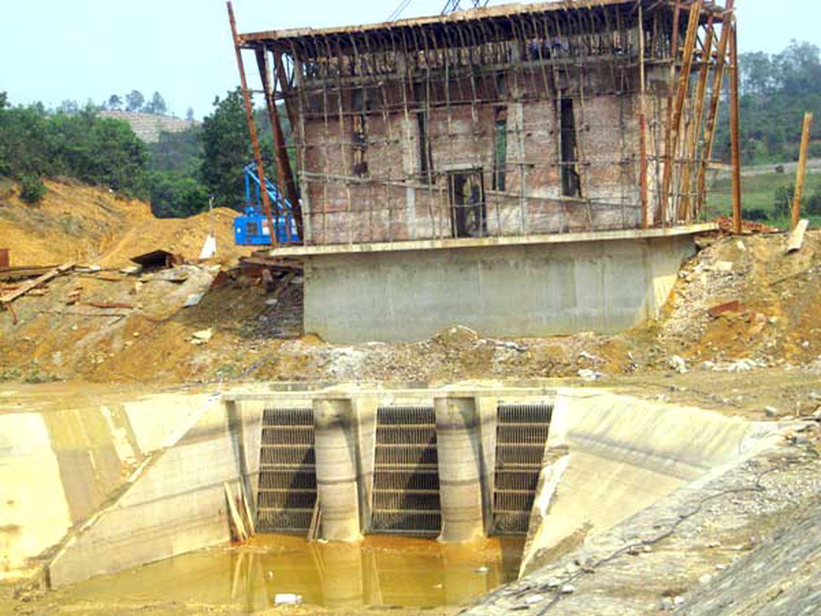 Cống dẫn nước về kênh tại đập dâng Vũ Quang đang được thi công cầm chừng. ảnh: Trần Quý