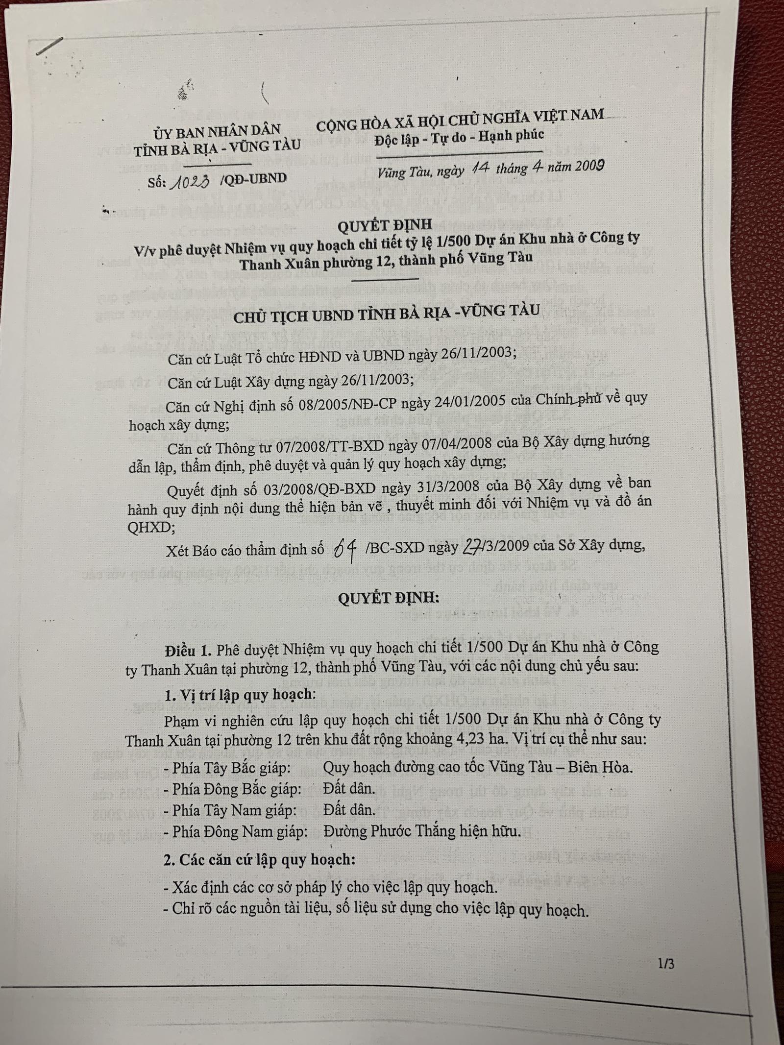 Quyết định số 1023/QĐ-UBND về việc Phê duyệt Nhiệm vụ quy hoạch chi tiết tỷ lệ 1/500 Khu nhà ở thương mại thấp tầng, tại phường 12, TP Vũng Tàu