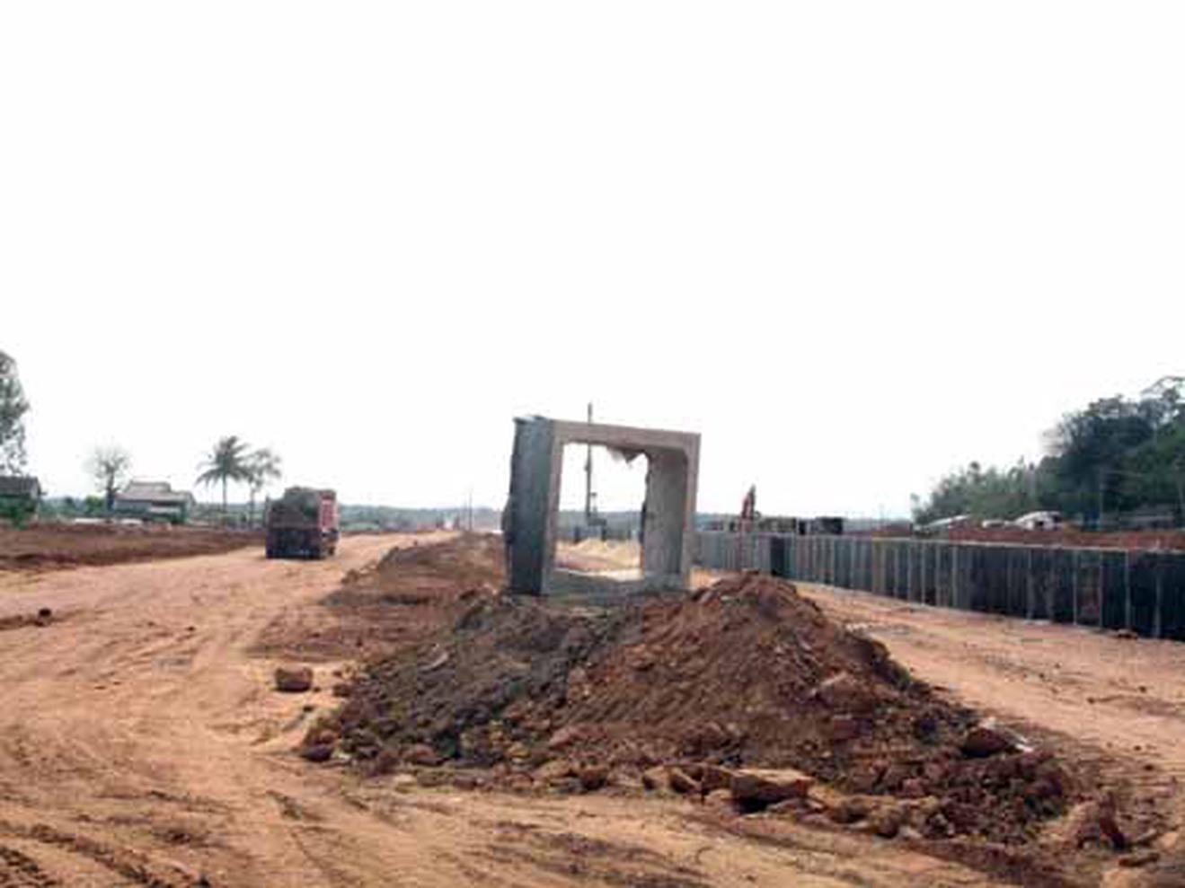 Từ trung tâm xã Bình Trung, chiều ngày 3/10, một người dân tình nguyện đưa chúng tôi đến hiện trường đường cao tốc ĐN-QN bằng xe máy cà tàng. Vượt qua hơn 3 km đường đồng ruộng lầy lội rồi đường đồi núi quanh co, sạt lở và đầy gai góc, chúng tôi đặt chân đến cửa phía Đông cầu chui số 103+540 có chiều dài 26m, cao 3m thuộc địa phận xã Bình Nguyên (Bình Sơn).