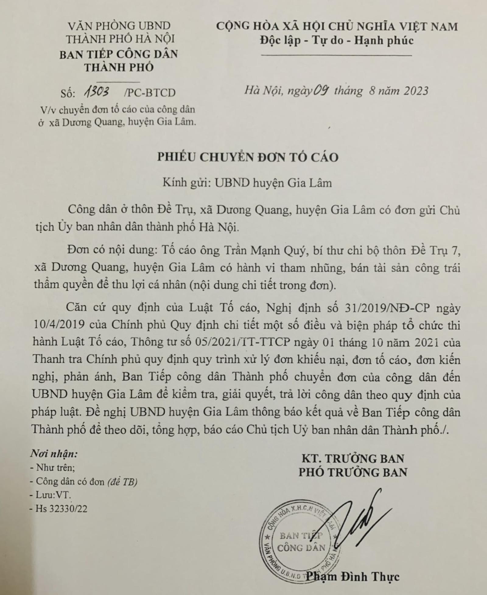 Liên quan đến vụ việc này, ngày 9/8/2023, Ban Tiếp công dân TP Hà Nội cũng đã có Phiếu chuyển đơn số 1303/PC-BTCD về việc chuyển đơn tố cáo của công dân ở xã Dương Quang đến UBND huyện Gia Lâm để được giải quyết theo quy định của pháp luật.