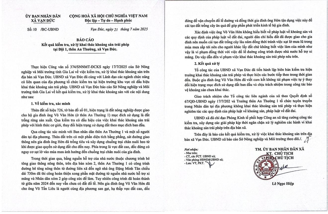 Ngày 21/7/2025, UBND xã Vạn Đức đã có Báo cáo số 10 /BC-UBND gửi Sở Nông nghiệp và Môi trường tỉnh Gia Lai về kết quả kiểm tra, xử lý khai thác khoáng sản. Ảnh: BT