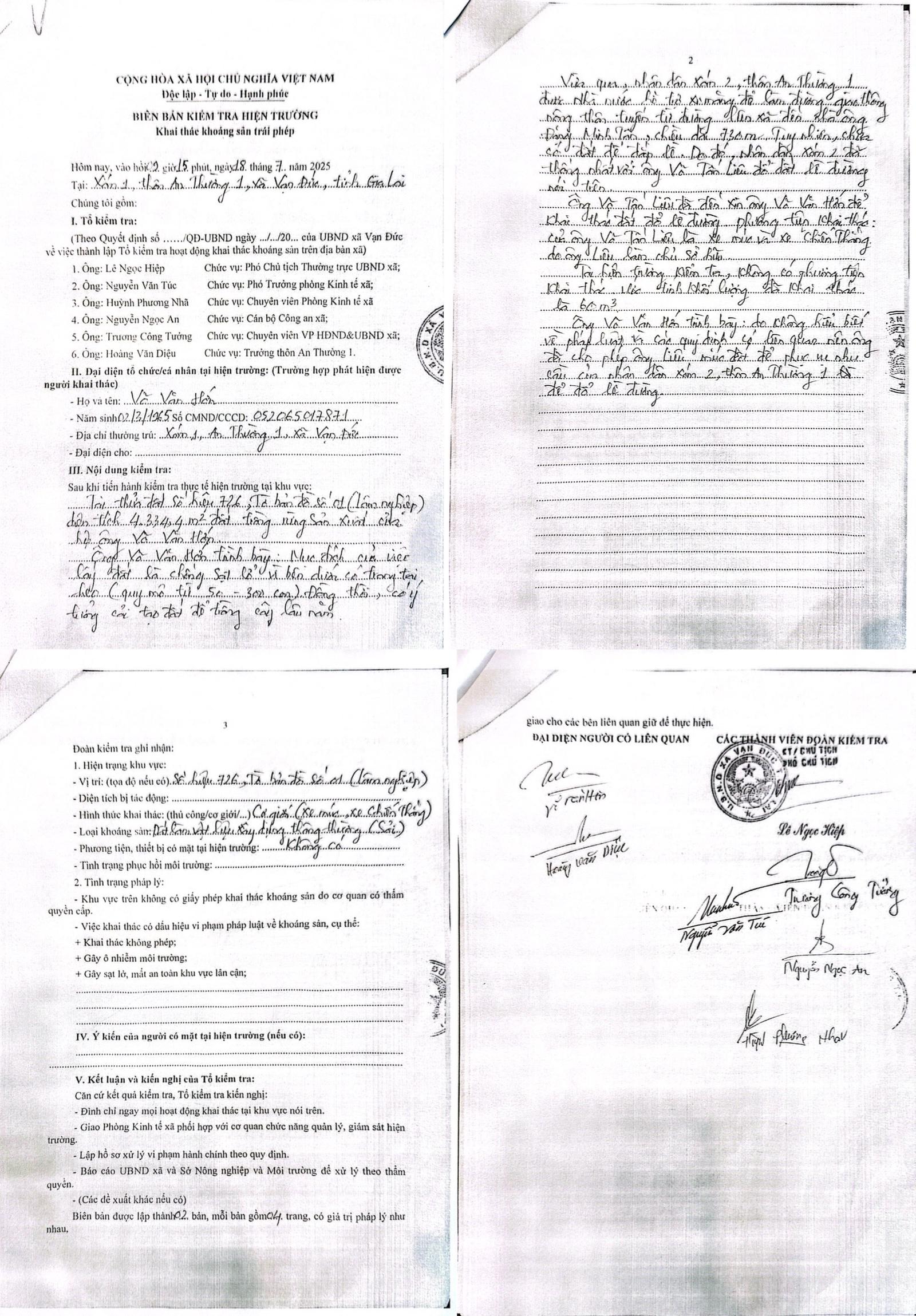 Về kiểm tra, xác minh thửa đất số hiệu 726, tờ bản đồ số 01, hiện trạng là đất nông nghiệp được giao cho hộ gia đình ông Võ Văn Hớn (ở thôn An Thường 1, xã Vạn Đức, tỉnh Gia Lai) mục đích sử dụng là đất trồng rừng sản xuất. Qua kiểm tra có dấu hiệu của việc khai thác khoáng sản trái phép với hình thức cơ giới, thay đổi hiện trạng sử dụng đất theo mục đích ban đầu.
